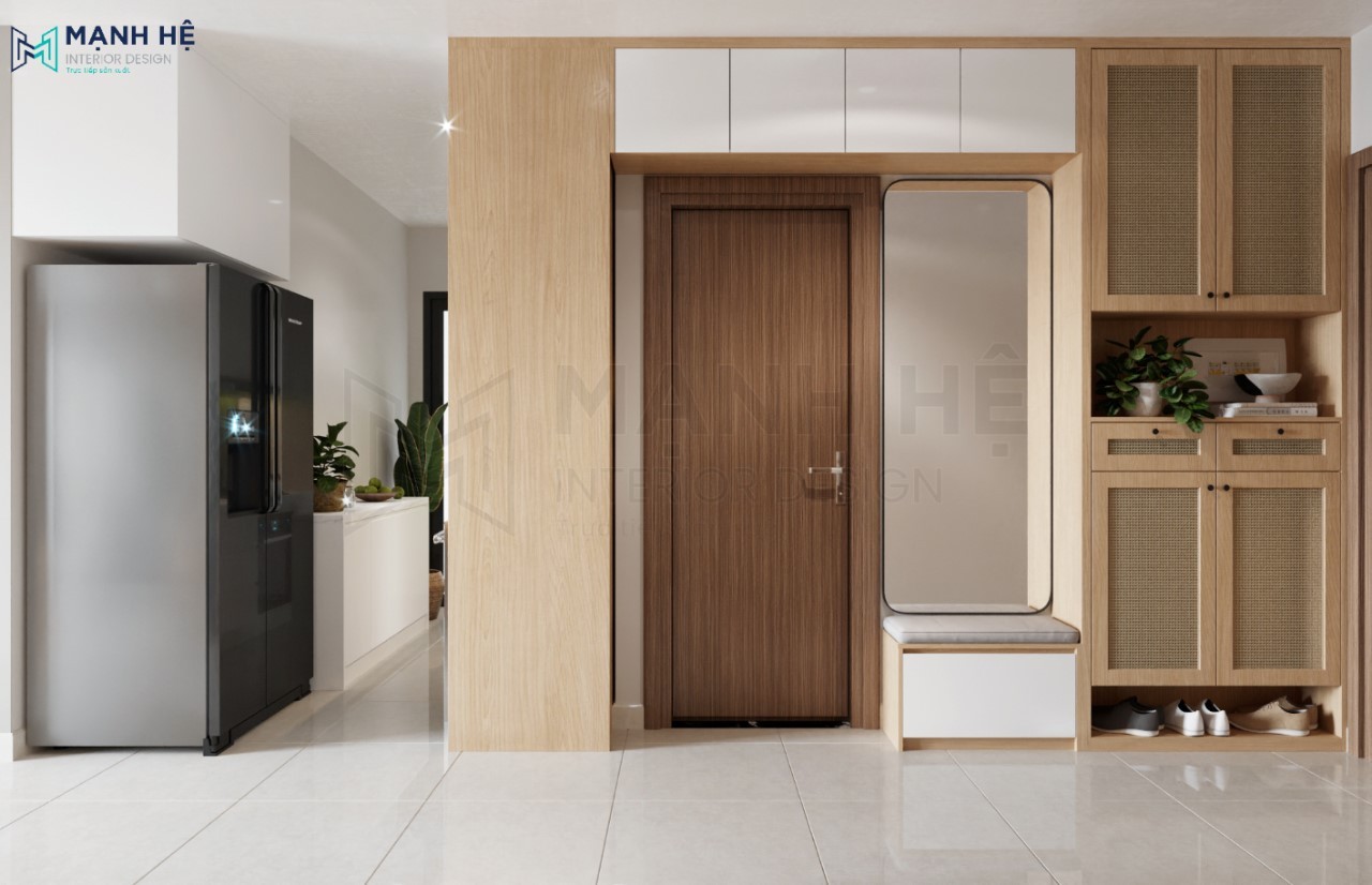 Điểm đặc biệt của căn hộ là thiết kế hệ tủ giày cao đụng trần từ gỗ công nghiệp phủ melamine với 2 gam màu: trắng – gỗ nhạt. Thêm gương và ghế ngồi thay giày cho tiện nghi.