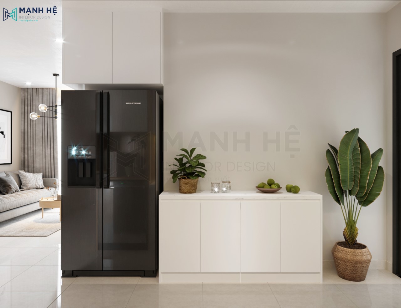 Tủ lạnh được bố trí trong ngăn tủ riêng, kế bên là tủ đựng đồ gia dụng nhà bếp nhỏ gọn