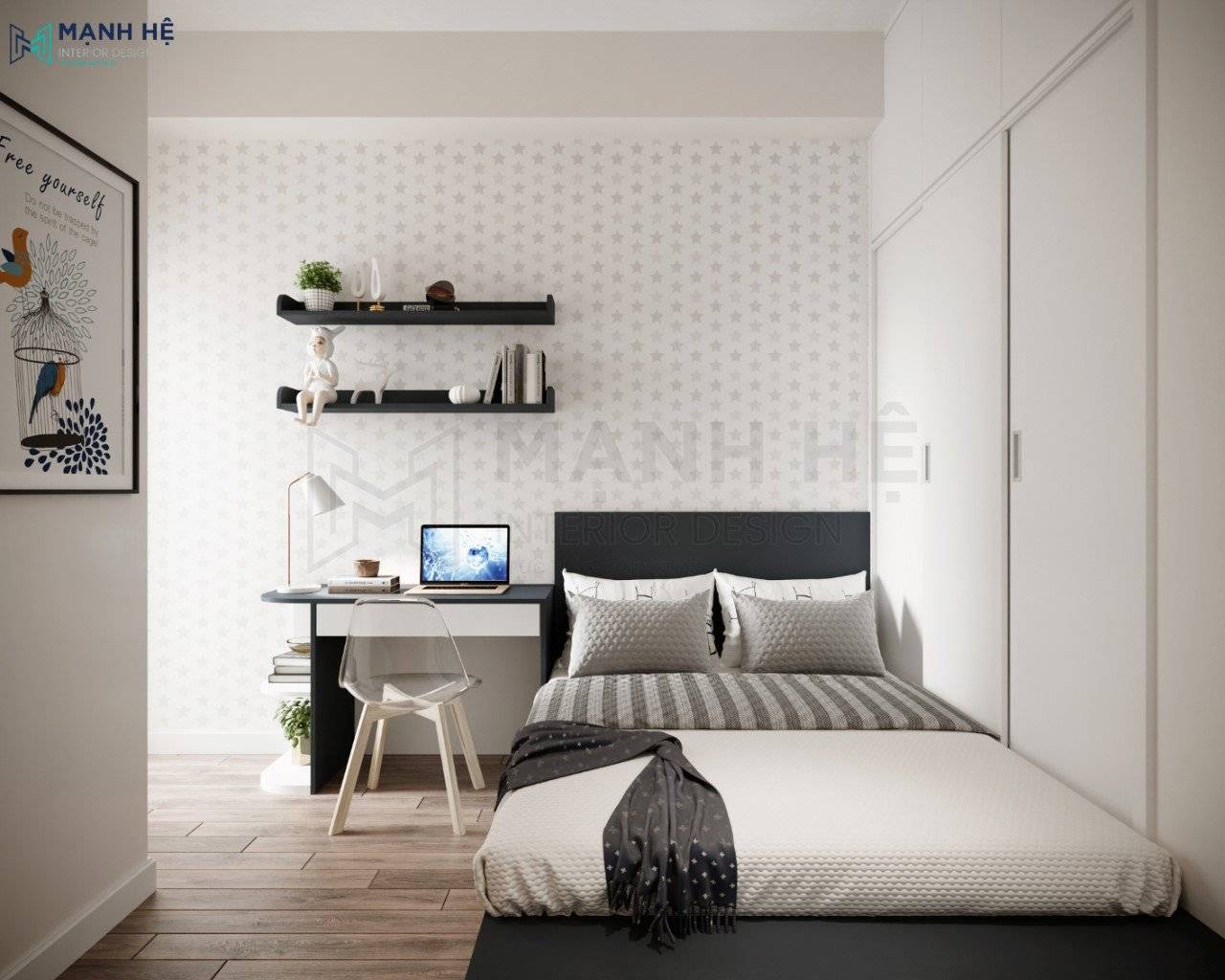 Bố trí giường ngủ sát tường được làm từ gỗ công nghiệp với màu trắng nhã nhặn, vách ốp tường phía sau màu ghi cùng kệ trang trí treo tường tiện nghi vừa đảm bảo tính thẩm mỹ, vừa mang đến cảm giác sạch sẽ, mát mẻ cho căn phòng.