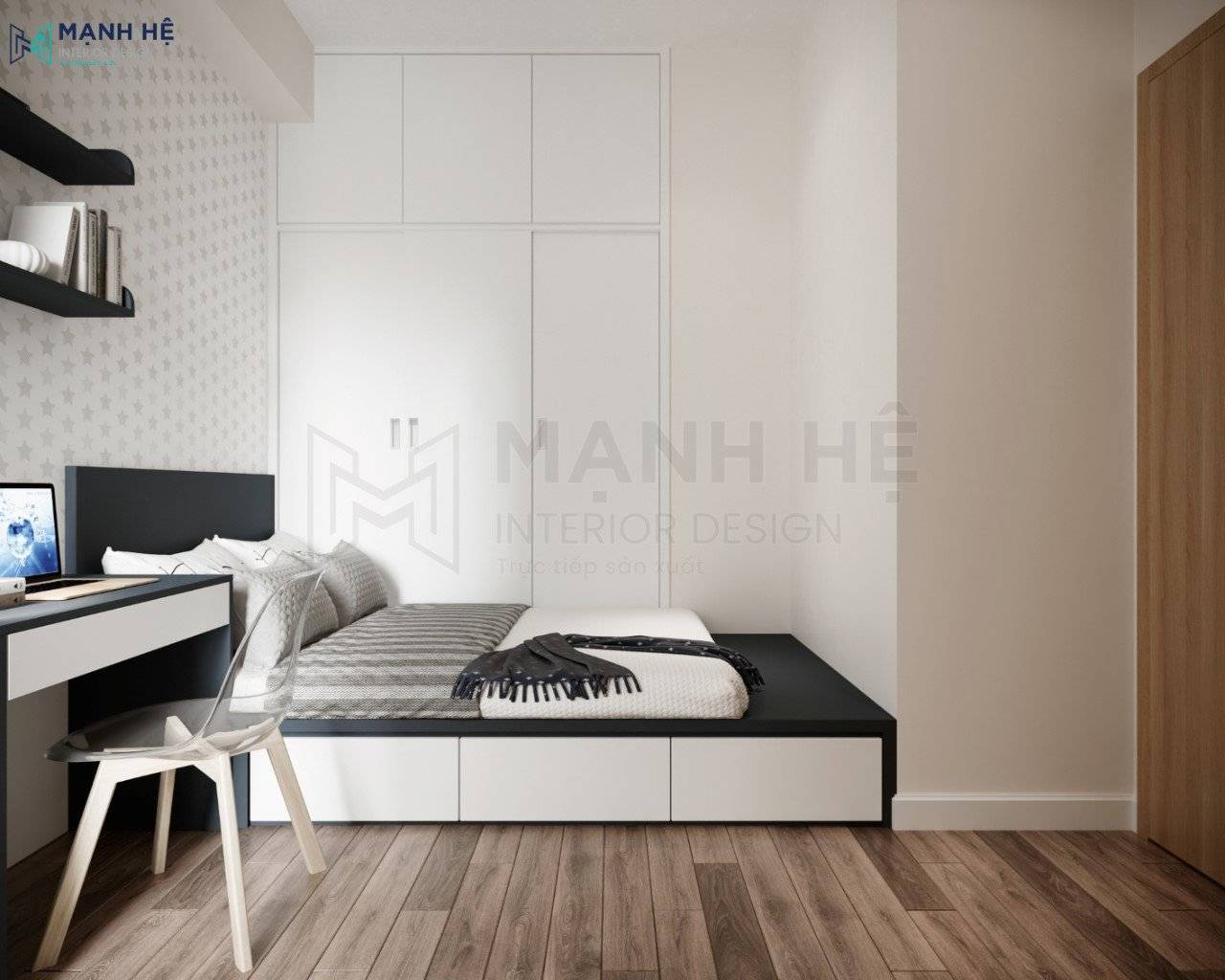 Thiết kế nội thất phòng ngủ trẻ em đơn giản, đầy đủ tiện nghi. Bố trí giường ngủ dạng bục kết hợp cùng tủ quần áo âm tường giúp tiết kiệm không gian cho phòng ngủ nhỏ.