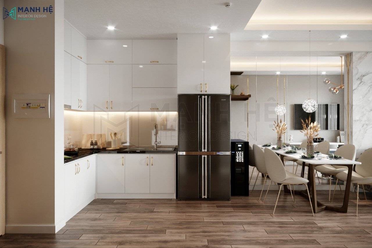 Sử dụng hệ tủ bếp chữ L đụng trần gỗ công nghiệp phủ acrylic bóng gương màu trắng nhã nhặn mang lại cảm giác sạch sẽ, thoáng mát, tạo nên một không gian phòng bếp hoàn mỹ. Tận dụng góc chế để bố trí tủ bếp cũng giúp tiết kiệm diện tích cho căn phòng.
