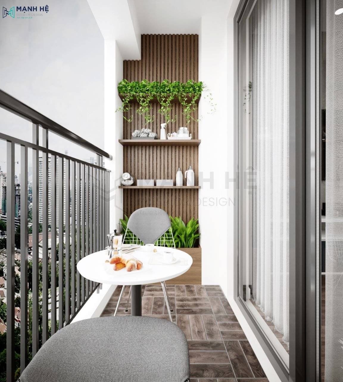 Thiết kế khu vực ban công nhỏ gọn, bố trí một bàn trà nhỏ cùng những chậu cây xanh mang đến không gian thoáng mát. Sử dụng vách ốp gỗ nhựa chống nước để khu vực ban công thêm sạch sẽ. Chắc chắn đây là góc nhỏ lý tưởng cho Gia chủ thư giãn vào cuối tuần.