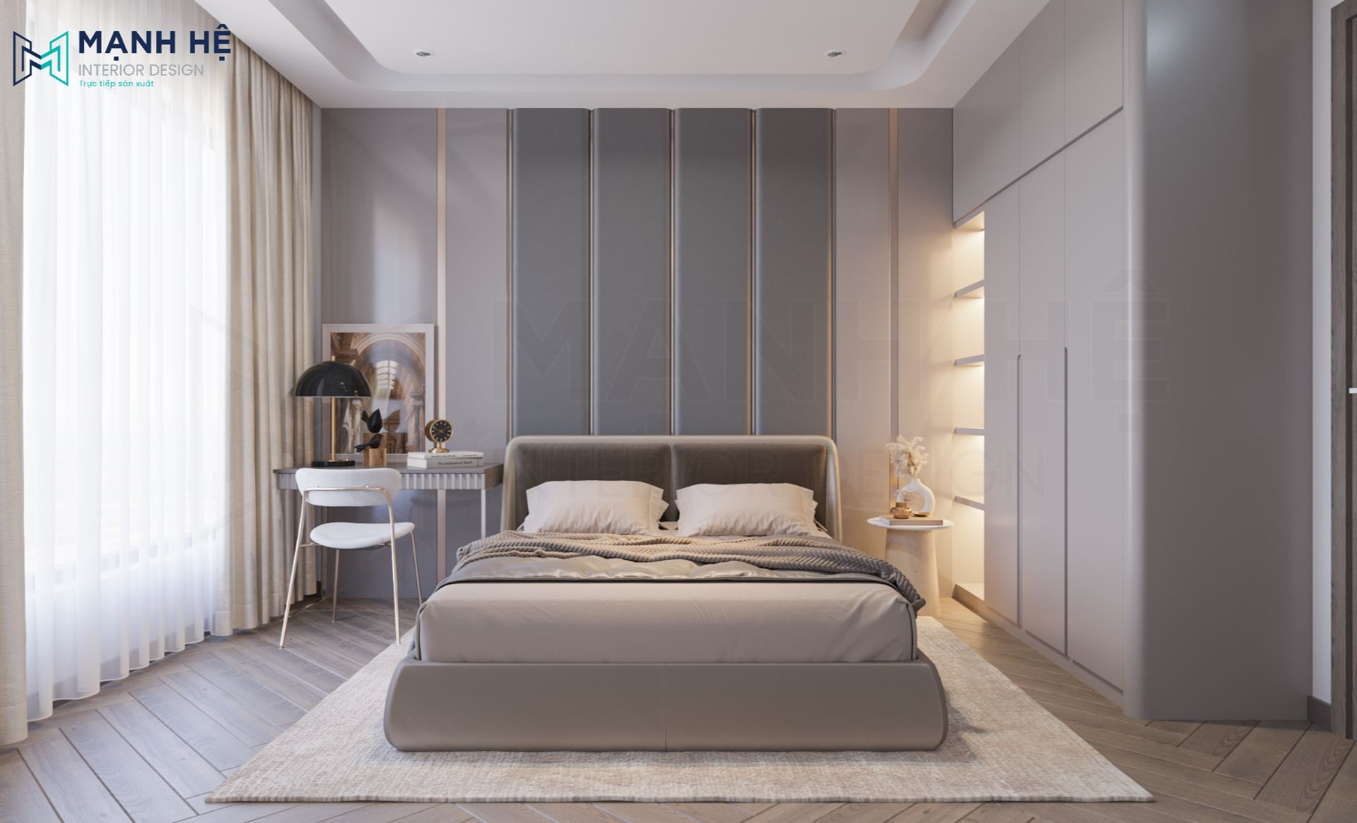 Khu vực giường ngủ có đầu giường sử dụng vách ngăn bằng ốp nỉ sọc dọc song song đan xen giữa hai màu vừa tạo điểm nhấn thu hút, vừa giúp cách âm và cách nhiệt tốt cho không gian.