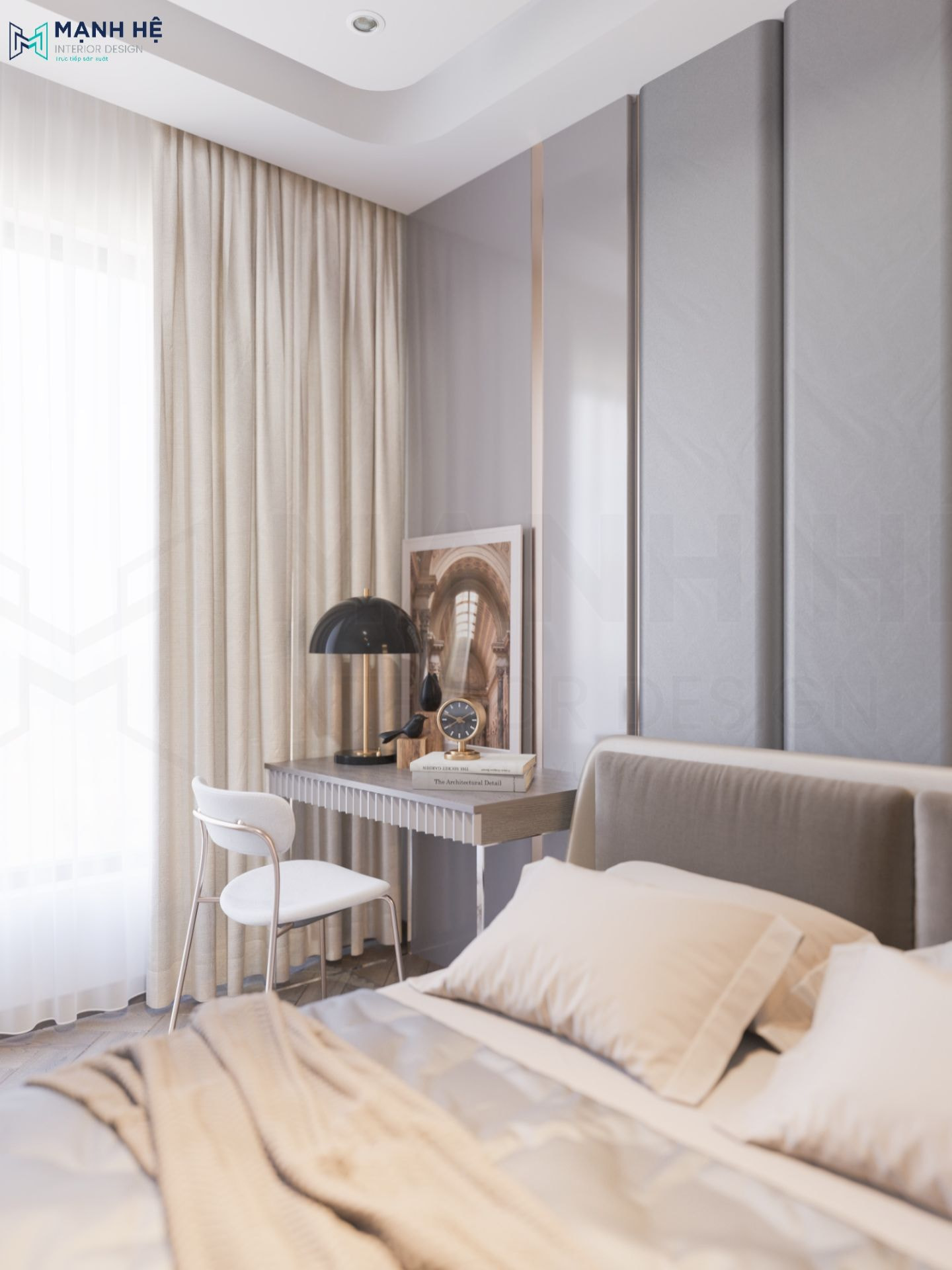 Trái ngược hoàn toàn với những không gian khác trong căn hộ, mẫu phòng ngủ này sử dụng tông màu chủ đạo kem, be trắng đã mang đến vẻ đẹp nhẹ nhàng và tinh tế cho không gian. Với khung cửa sổ lớn kèm rèm che linh hoạt càng khiến không gian trở nên sáng sủa và rộng rãi hơn.