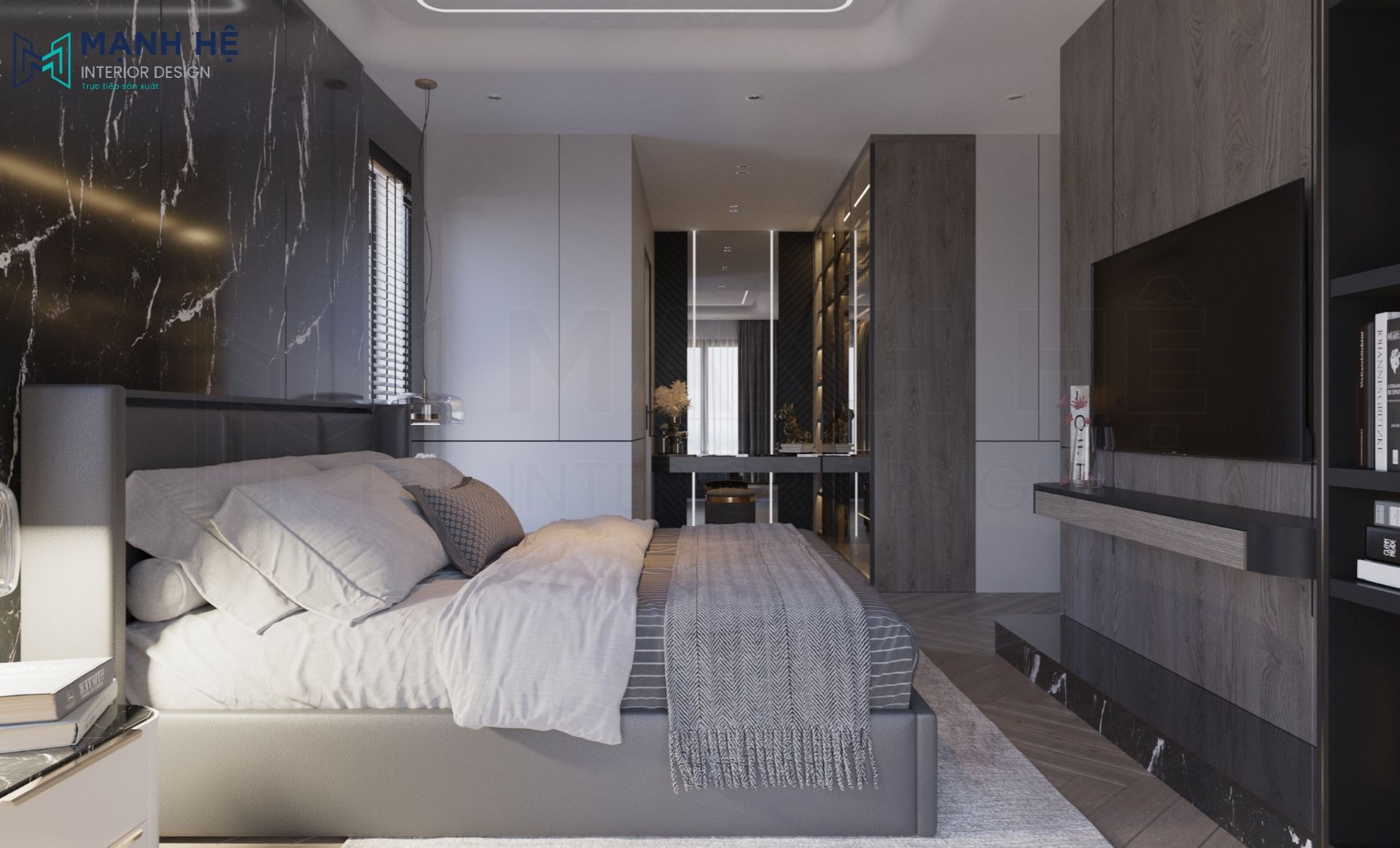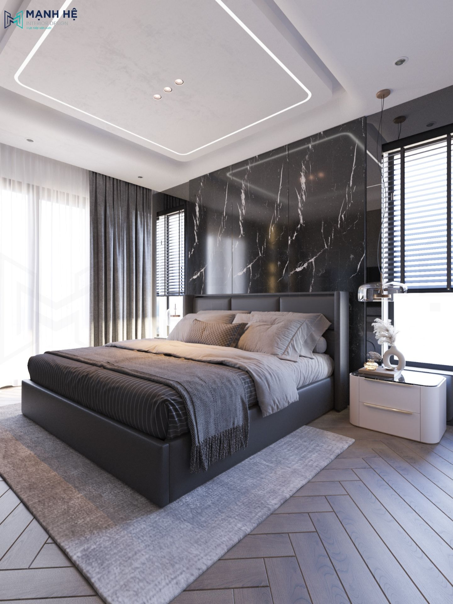 Vì có không gian phòng ngủ rộng rãi, mẫu phòng ngủ master này không sử dụng những gam màu tươi sáng thường thấy ở những căn hộ chung cư theo phong cách hiện đại khác, thay vào đó là tông màu đen xám trắng tạo nên vẻ sang trọng và quý phái, đặc biệt phải kể đến vách ốp đá Marble có đường vân mây độc đáo.