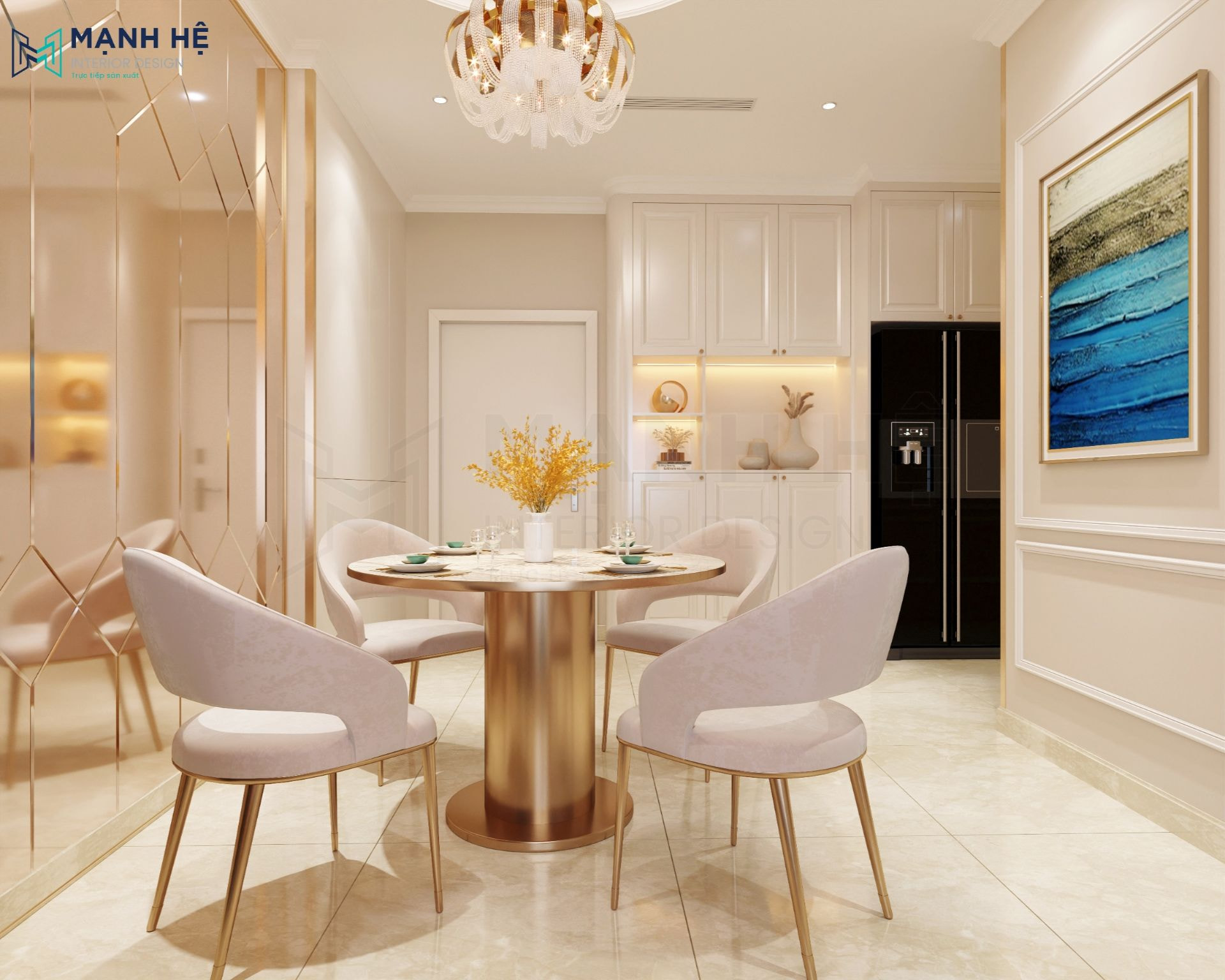 Ý đồ của gia chủ chúng tôi muốn thiết kế phòng ăn giữa phòng khách và phòng bếp bởi họ muốn phòng ăn như vách phân cách ngăn chia hai khu vực này. Đồng thời, việc thiết kế này sẽ giúp thuận tiện cho gia chủ di chuyển nấu nướng và ăn uống. Sử dụng kính thủy mờ ốp tường không phải là lựa chọn phổ biến của nhiều khách hàng hiện nay, nhưng theo tư vấn của Mạnh Hệ cho anh Tâm nếu muốn tăng sự đẳng cấp và sang trọng cho không gian này, anh sử dụng loại kính trên là hoàn toàn hợp lý. Lời đề nghị của Mạnh Hệ đã được anh tham khảo và đồng ý làm theo kiểu thiết kế đó. Và cuối cùng, anh nhận lại một sự hài lòng hơn cả mong đợi.