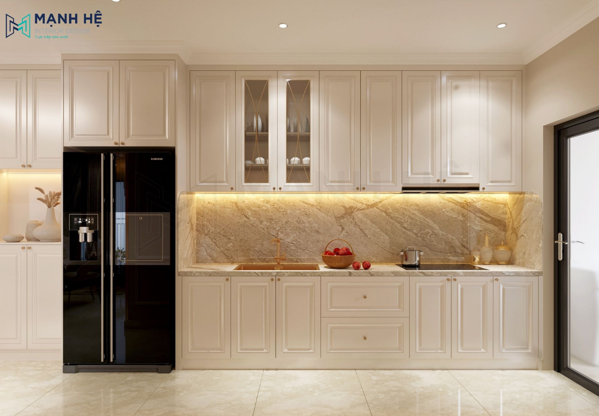 Nối tiếp phòng ăn là phòng bếp nội thất gỗ bền – đẹp được thiết kế dựa trên công năng và thẩm mỹ mà gia chủ yêu cầu. Hệ tủ bếp chữ I gỗ tự nhiên bền, thẩm mỹ lấy gam màu trắng chủ kết hợp tay nằm tròn mạ vàng. Khoảng giữa hệ tủ bếp trên và tủ bếp dưới ốp đá sang trọng, thuận tiện cho gia chủ khi lau chùi. Các ngăn hộc tủ rộng rãi làm nơi lưu trữ chén, bát, đồ khô. Tủ lạnh cũng được tích hợp vào chung hệ tủ bếp.