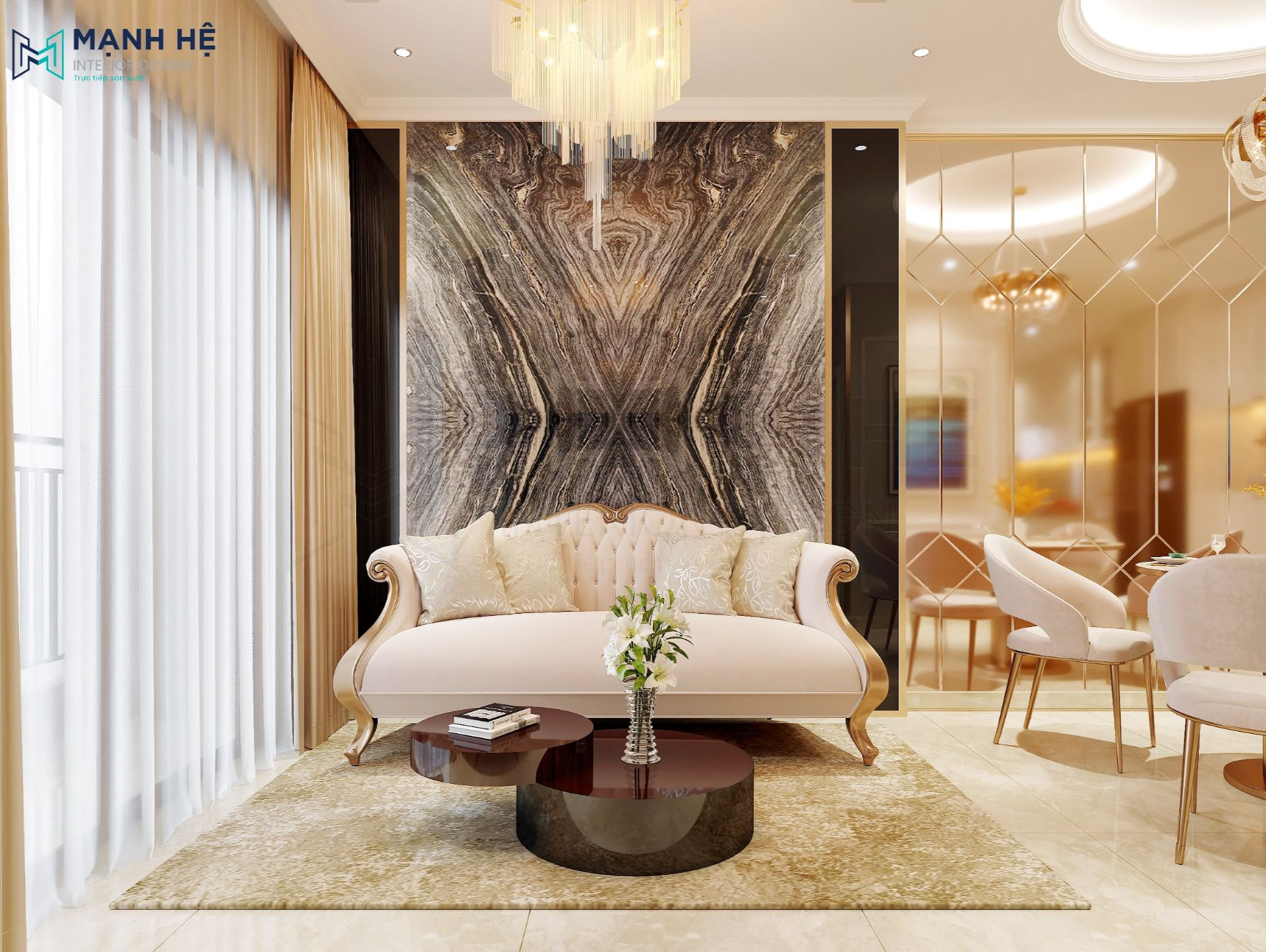Vách ốp đá PVC phía sau sofa kết hợp nẹp chỉ vàng rực rỡ