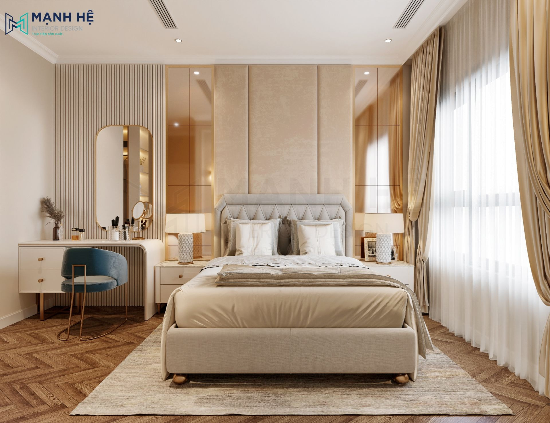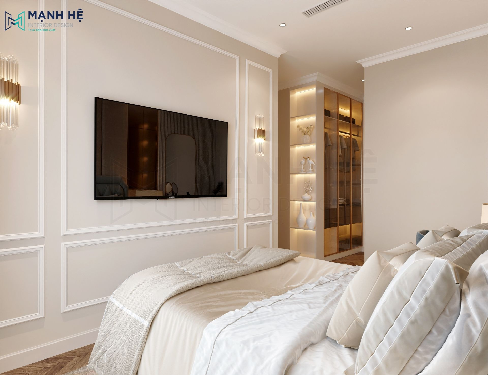 Nội thất cơ bản của căn phòng gồm: giường ngủ, tủ quần áo cánh kính âm tường, bàn trang điểm. Giường ngủ bọc đệm đồng bộ vách ốp tường đầu giường. Nội thất phòng ngủ master được chạy nẹp vàng đúng “chất” của phong cách Luxury xa hoa. Vách ốp tường sau tivi chạy phào chỉ trắng, hệ thống đèn led âm trần giúp cân đối ánh sáng toàn căn phòng. Ngoài ra, sử dụng rèm cửa hai lớp giúp tận dụng ánh sáng tự nhiên bên ngoài cho căn phòng thêm thông thoáng hơn.