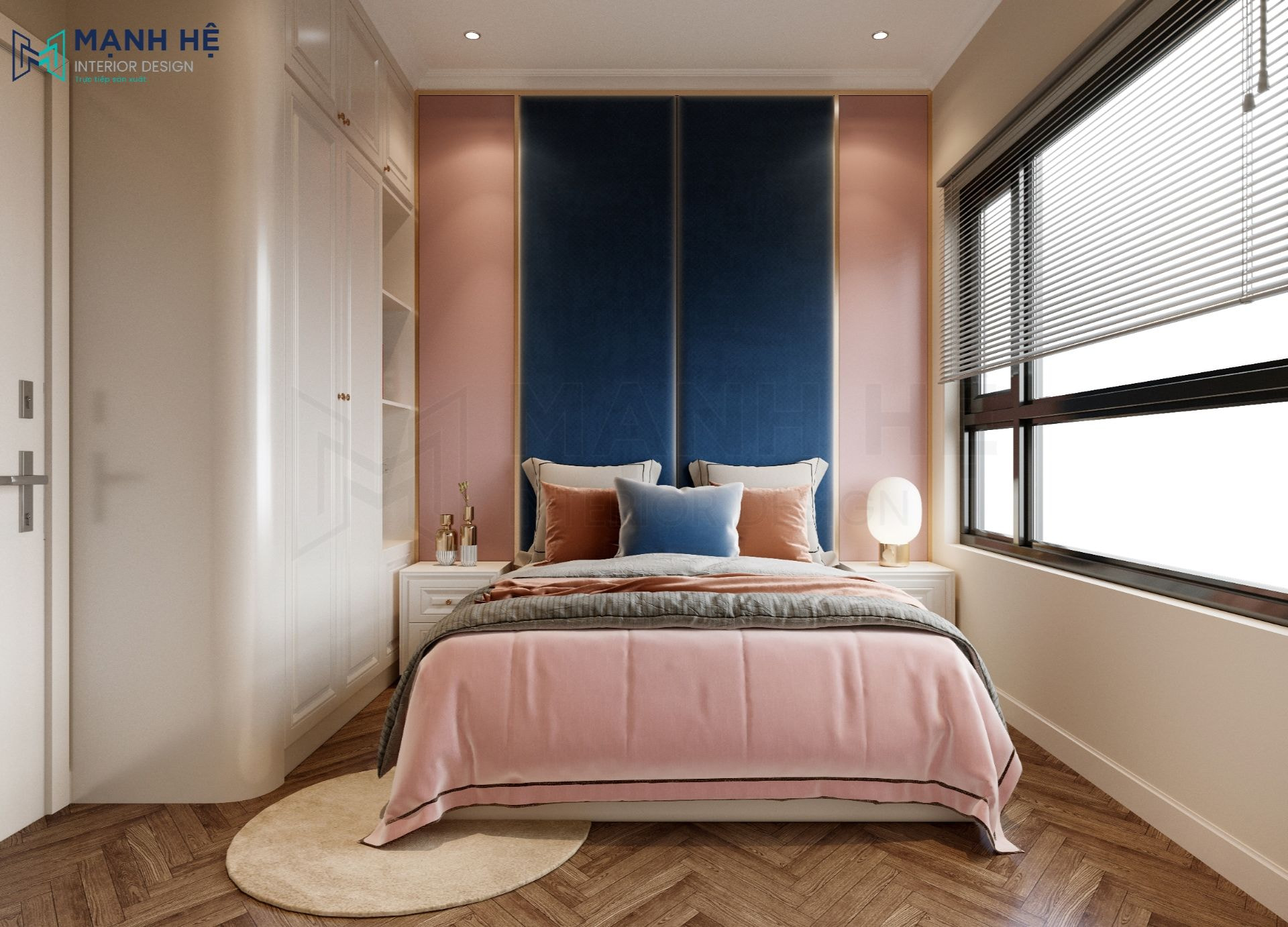 Tuy vẫn lấy phong cách Luxury làm phong cách chủ đạo nhưng dường như phòng ngủ bé gái đã không còn dựa màu vàng vốn dĩ của phong cách đó để cân đối, thay vào đó các KTX Mạnh Hệ vẫn chạy nẹp vàng cho vách ốp tường đầu giường nhưng lấy gam màu hồng phối màu xanh để tăng sự nổi bật cho cả căn phòng. Đồng thời, vách ốp đầu giường kết hợp các món đồ như chăn, gối có màu nhẹ nhàng phù hợp với lứa tuổi của các bé.
