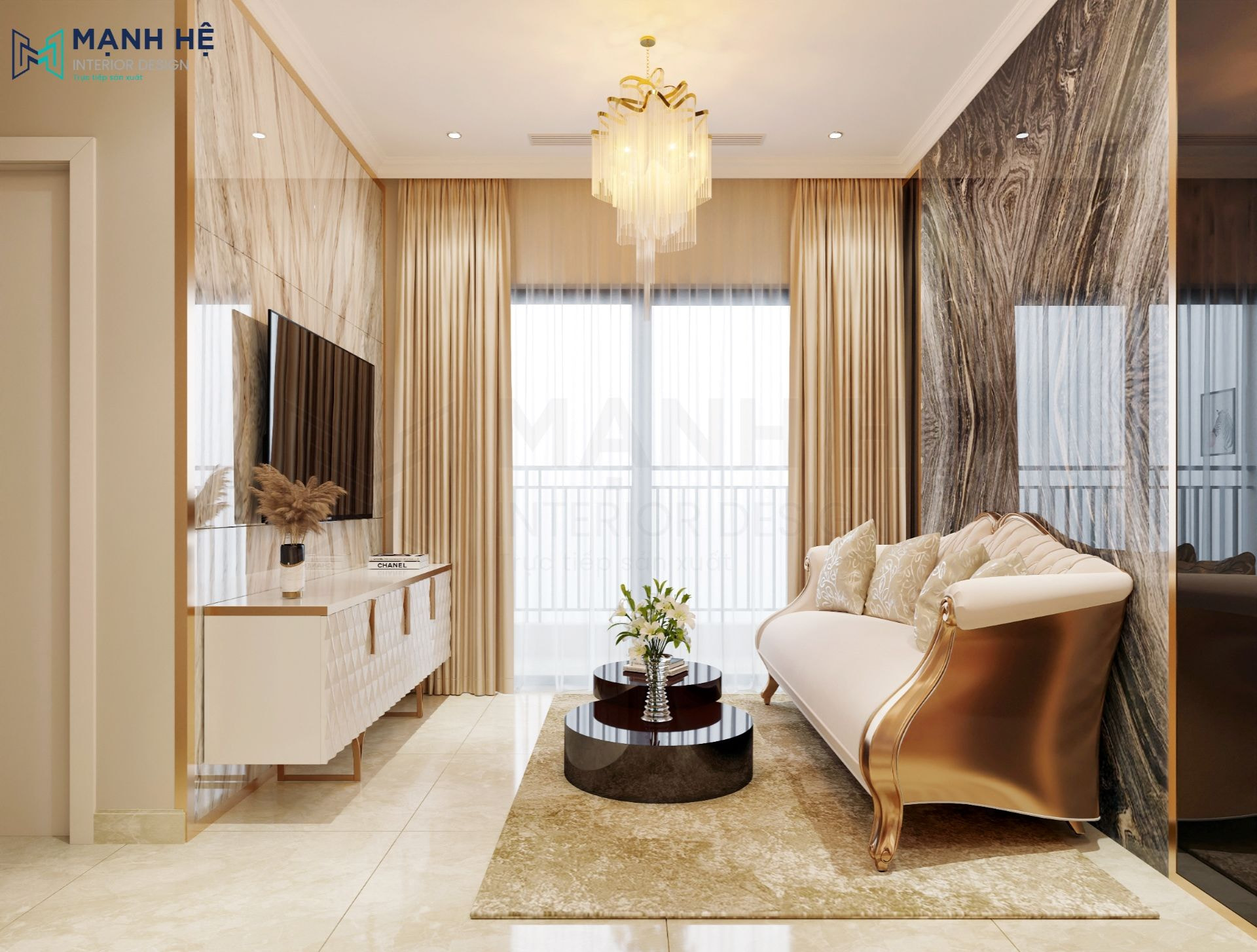 Không gian phòng khách chung cư sẽ bao trùm màu vàng là đặc điểm nổi bật theo phong cách Luxury, không gian căn hộ này cũng vậy. Chạy nẹp chỉ vàng trong cách món nội thất như vách ốp tường, tay nắm, khung chân kệ tivi,… giúp tăng sự nổi bật của không gian.
