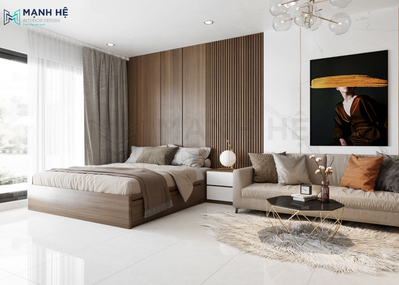 Bố trì giường ngủ gỗ công nghiệp cạnh cửa sổ, vách ốp tường màu nâu với các lam gỗ tinh tế. Tận dụng ánh sáng sau lớp rèm tạo không khí thoáng đãng, thư giãn cho gia chủ.