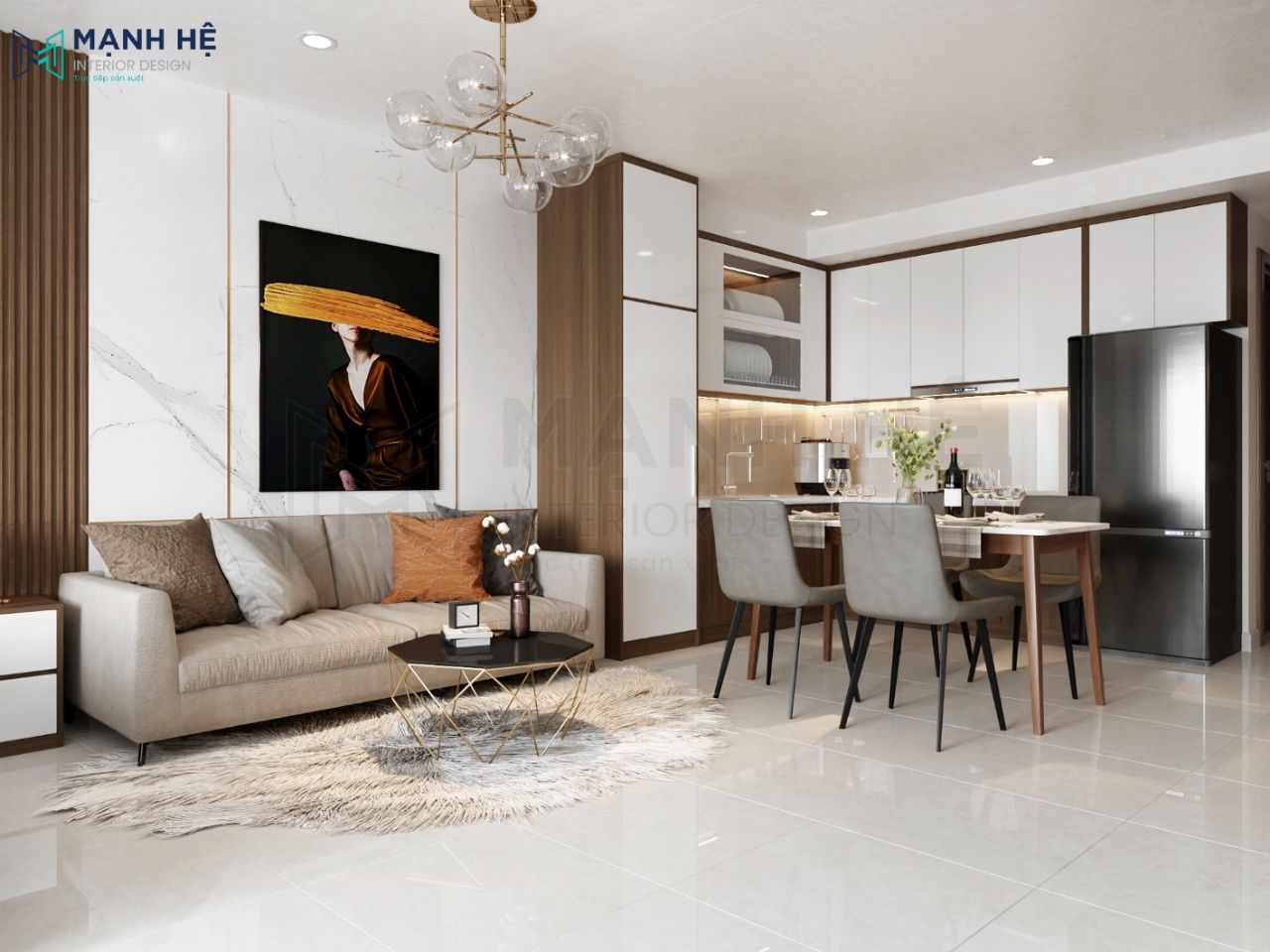 Bộ ghế sofa kết hợp bàn trà hiện đại đặt giữa không gian phòng khách và phòng bếp. Thảm lông và đèn trần thả là điểm nhấn của cả căn hộ. Ốp tường đá kết hợp đường ron vàng rực rỡ, trang trí thêm tranh vẽ treo tường.