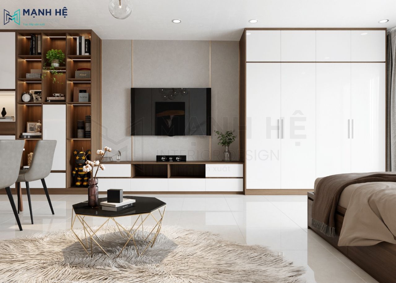 Không gian phòng khách liền phòng ngủ luôn là chọn ưu tiên cho căn studio diện tích nhỏ. Toàn bộ nội thất được làm từ gỗ công nghiệp phủ melamine với hai gam màu nâu trầm và màu trắng.