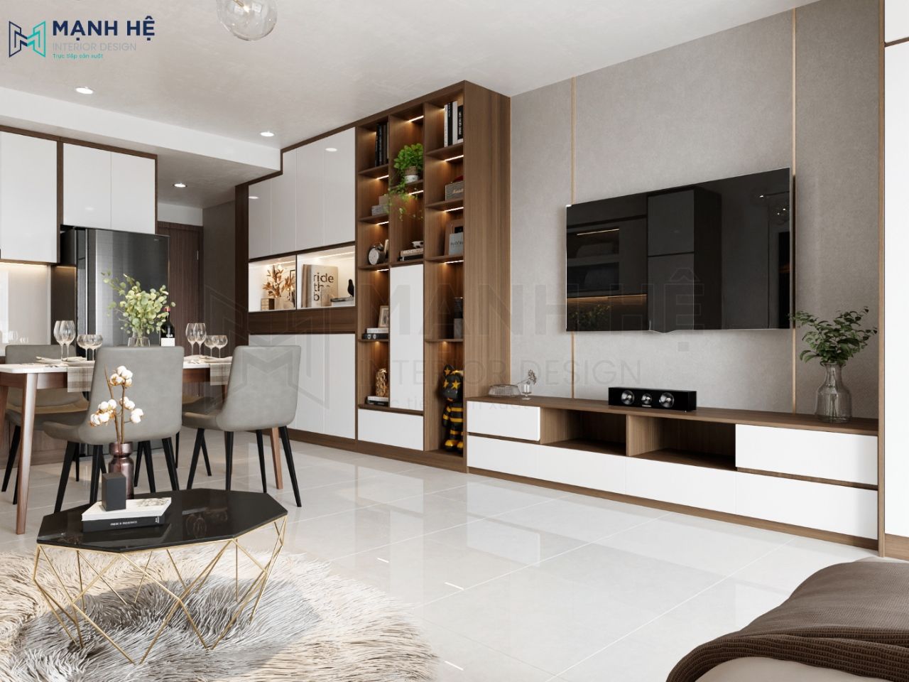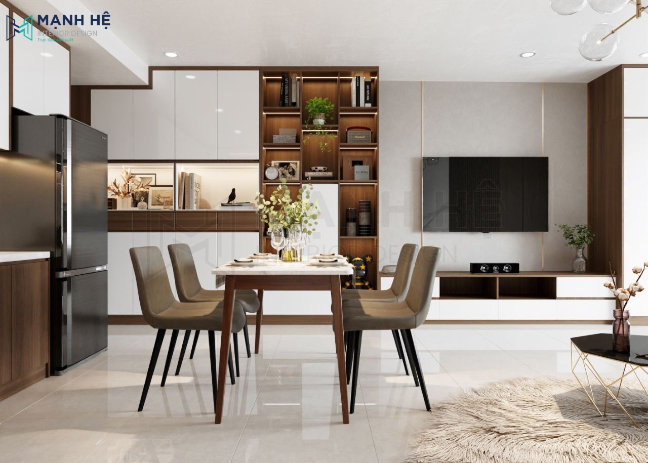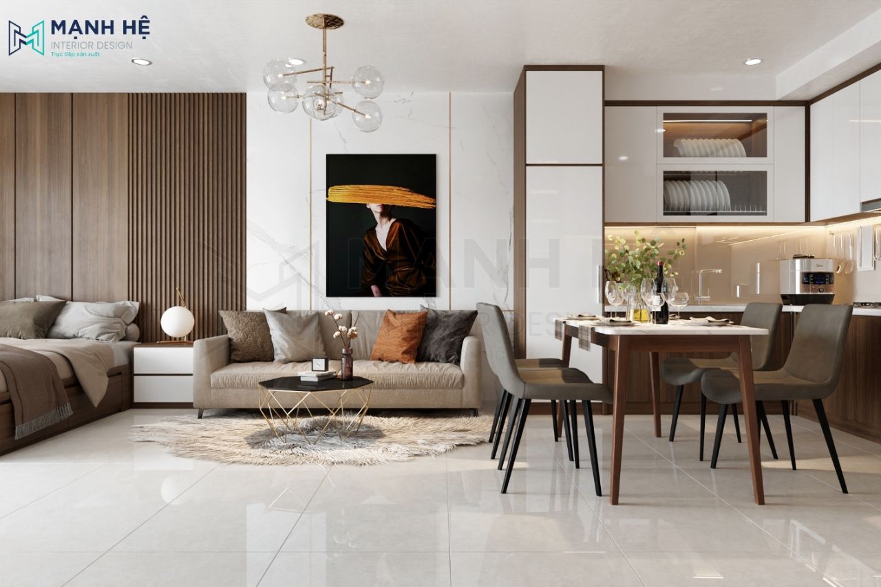 Sự liên kết giữa các không gian khách – bếp – phòng ngủ giúp tối ưu diện tích căn hộ đồng thời giúp gia chủ thuận tiện trong việc di chuyển và sinh hoạt.