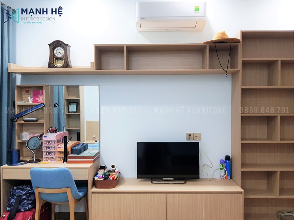 Thi công hệ tủ kệ trang trí được bố trí liền kề với kệ tivi và bàn trang điểm gọn gàng