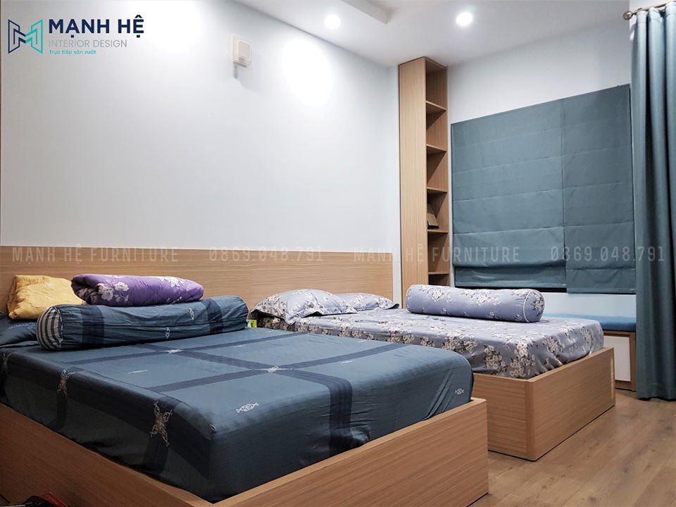 Hai chiếc giường ngủ bằng gỗ công nghiệp MDF Melamine có kích thước vừa phải, được bố trí song song. Nhưng tạo sự liền mạch nhờ vào vách ốp gỗ đầu giường sang trọng.
