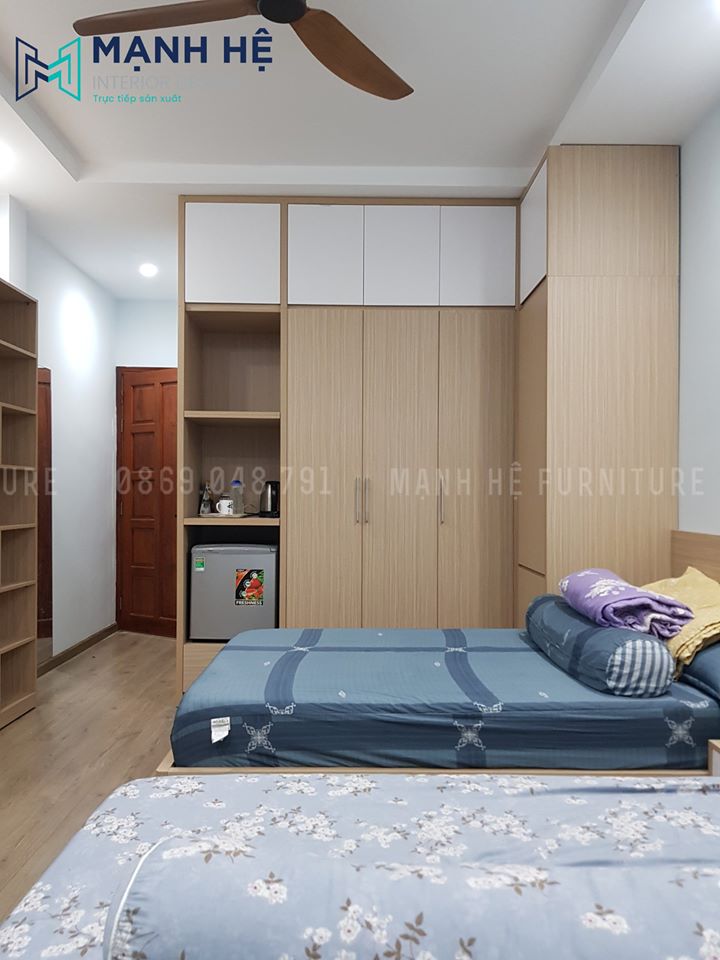 Cách thiết kế kiểu dán chữ L, nhằm tối ưu không gian đứng khi mở cánh tủ. Đồng thời, chiếc tủ được bó góc theo cạnh tường một cách rất khéo léo, kích thước vừa khít để liền kề với chiếc giường.