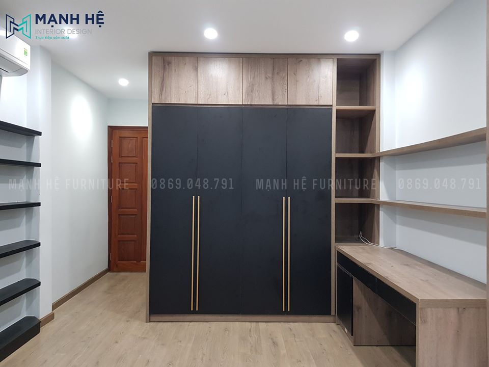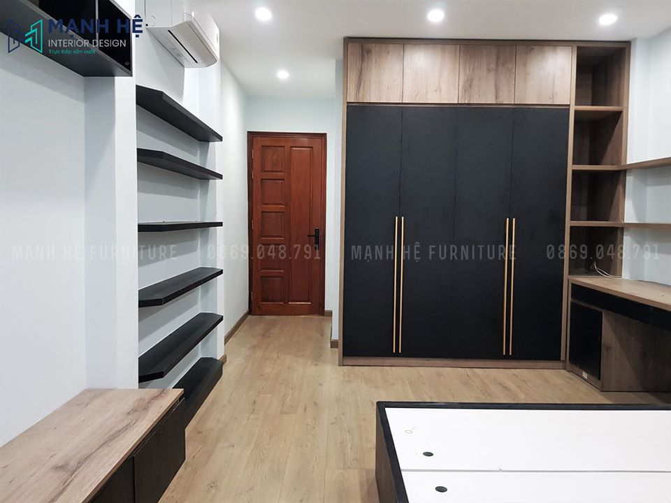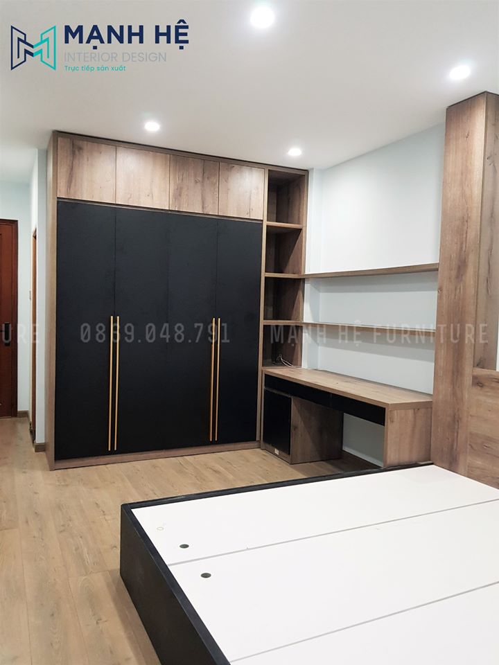 Đối với sở thích mạnh mẽ, trầm tính, hoang dã của con trai nhà anh Thiên. Các KTS Nội Thát Mạnh Hệ lựa chọn tone màu đen nhám – gỗ tự nhiên để tạo nên không gian phòng ngủ riêng.