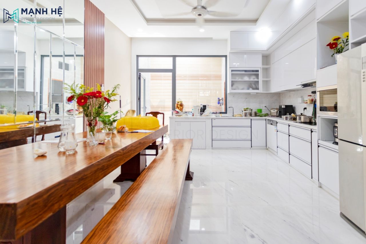 Thi công nội thất không gian phòng bếp sang trọng, hiện đại với gam màu trắng nền nã là gam màu chủ đạo mang đến cảm giác mát mẻ, sạch sẽ. Hệ tủ bếp thiết kế dạng L cao đụng trần tiện lợi, giúp tiết kiệm diện tích không gian cũng như tăng diện tích sử dụng cho gia chủ.