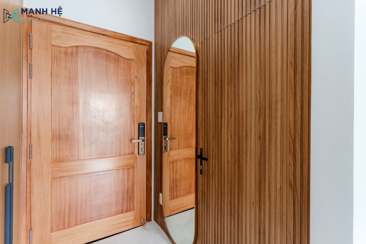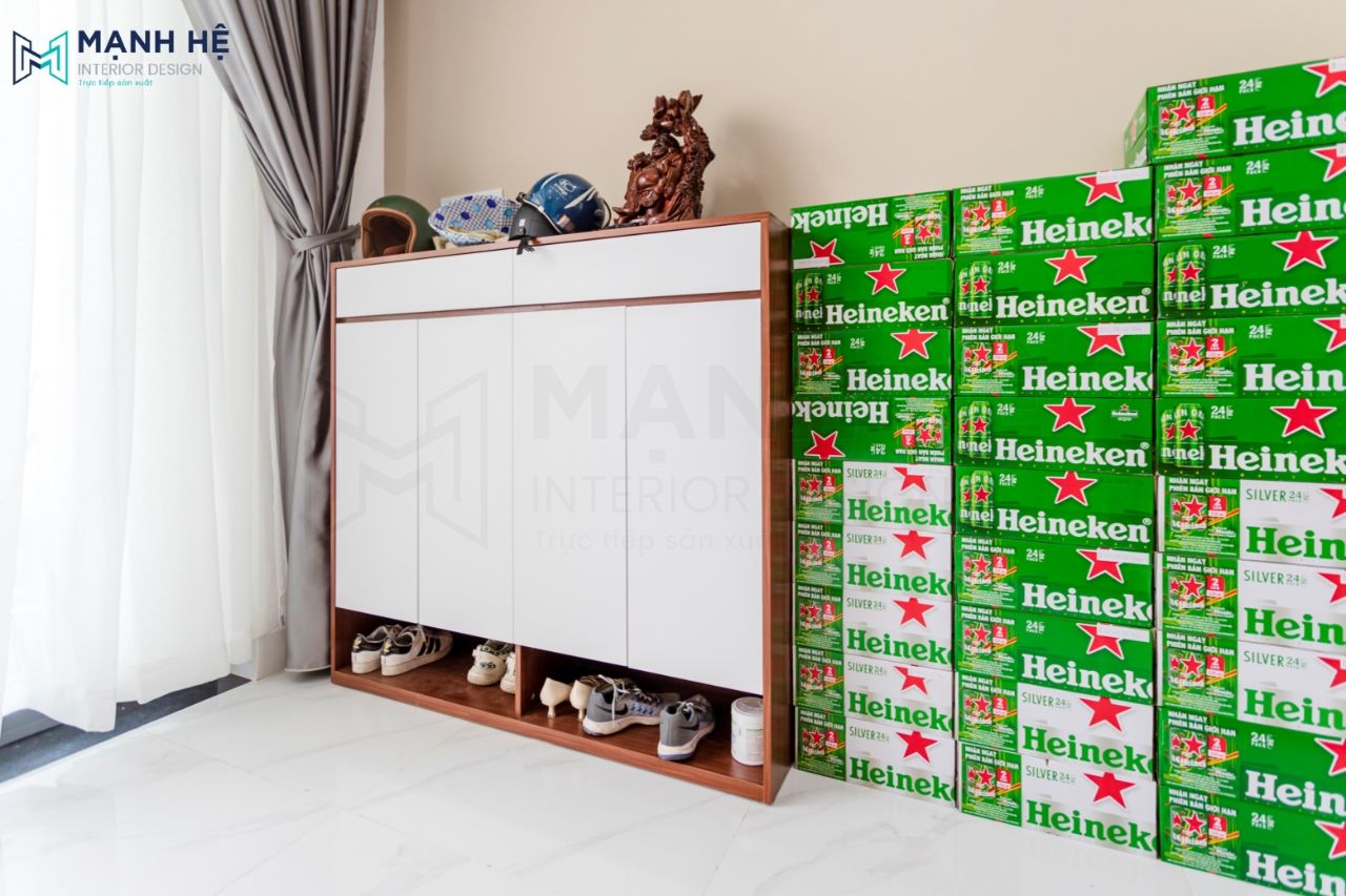 Bố trí tủ đựng giày được làm từ gỗ công nghiệp với màu trắng nhã nhặn kết hợp màu nâu gỗ ngay cửa ra vào giúp cho Gia chủ thuận tiện để giày cũng như những vật dụng cần thiết.