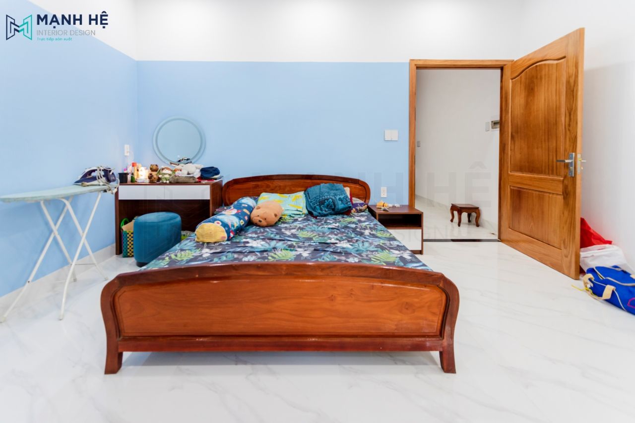 Không gian nội thất phòng ngủ nhà phố rộng rãi với nội thất cơ bản. Sơn tường màu xanh dương mang đến cảm giác mát mẻ cho không gian phòng ngủ. Bố trí nội thất phòng ngủ thông minh giúp tiết kiệm diện tích cho tổng thể.