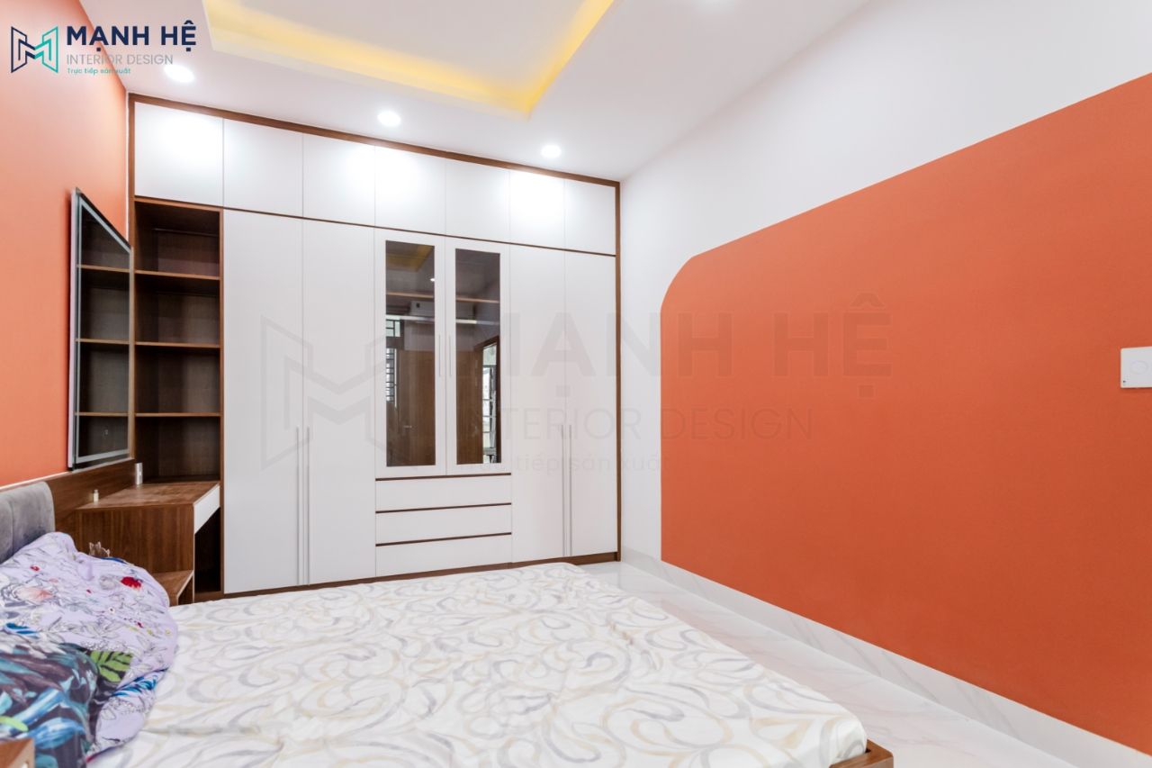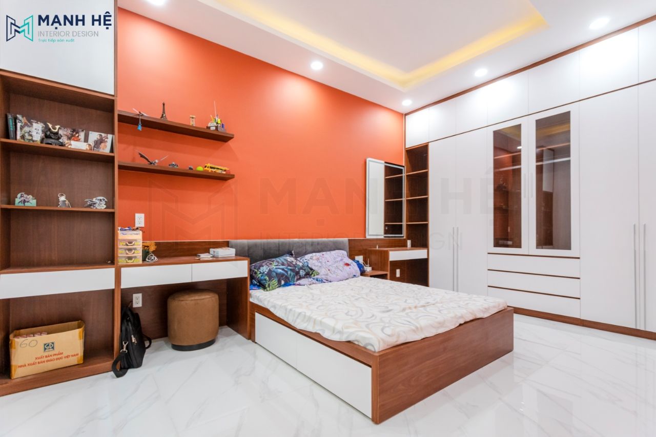 Nội thất nhà phố phòng ngủ được thi công hoàn thiện, độc đáo với sơn tường màu cam là điểm nhấn. Màu sắc nổi bật thể hiện được cá tính của Gia chủ. Tủ quần áo thiết kế cao đụng trần thiết kế cánh mở bằng chất liệu acrylic sáng bóng, nổi bật cả căn phòng.