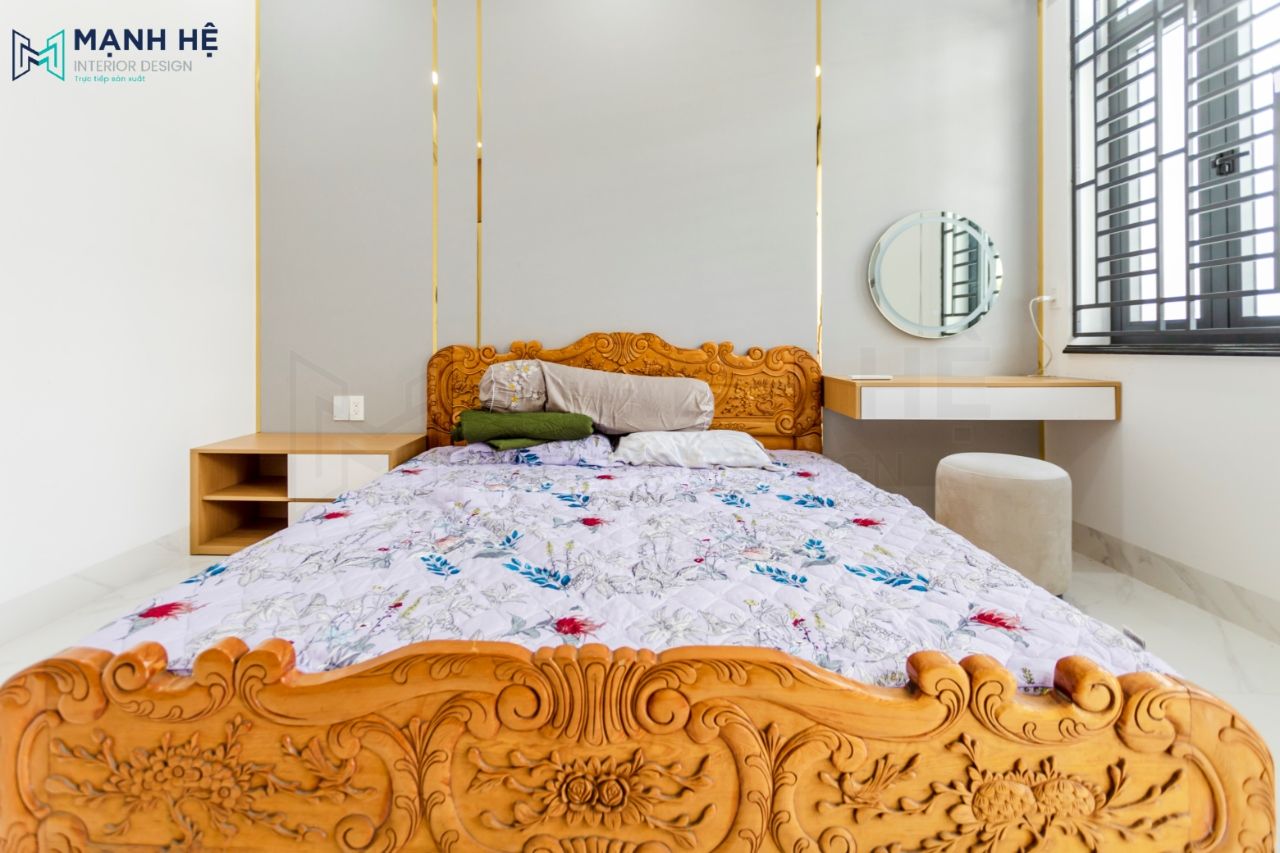 Hoàn thiện nội thất phòng ngủ master theo phong cách hiện đại, tiện nghi. Giường ngủ được thiết kế bằng những đường viền mềm mại, uyển chuyển, thanh lịch. Giường ngủ từ gỗ tự nhiên được trạm trổ, khắc họa những hoa văn tinh xảo, độc đáo toát lên được đẳng cấp của Gia chủ. Bên cạnh đó, đầu giường bố trí tab và bàn trang điểm đơn giản với màu trắng trang nhã, tăng thêm tính thẩm mỹ cho không gian.