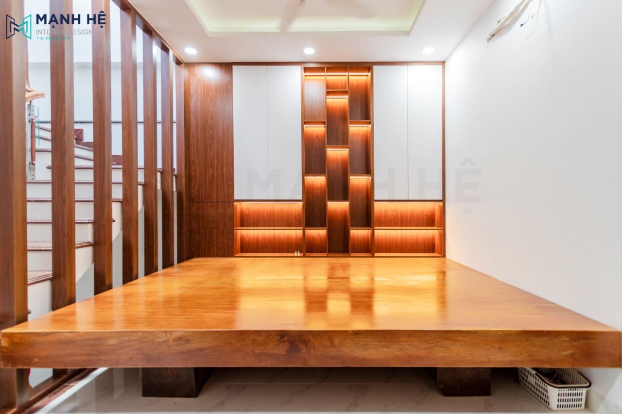 Thi công nội thất phòng sinh hoạt chung theo phong cách hiện đại, cao cấp với nội thất gỗ tự nhiên. Bố trí phản gỗ lớn ở giữa cho các thành viên trong gia đình có thể quây quần bên nhau khi trở về nhà sau mỗi ngày làm việc.