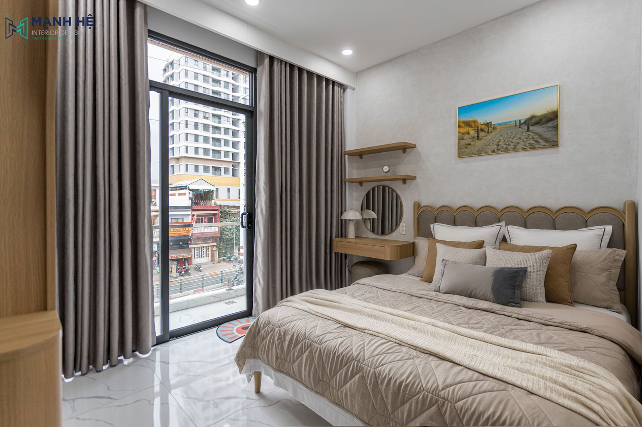 Phòng ngủ của chị gái được hoàn thiện theo tinh thần tối giản, nổi bật với góc bàn trang điểm bo cong mềm mại, tạo cảm giác nhẹ nhàng và dễ chịu khi sử dụng. Hệ tủ kịch trần cùng các kệ trang trí được bố trí gọn gàng, giúp không gian luôn thoáng và tiện nghi, đúng với mong muốn ban đầu của gia chủ.