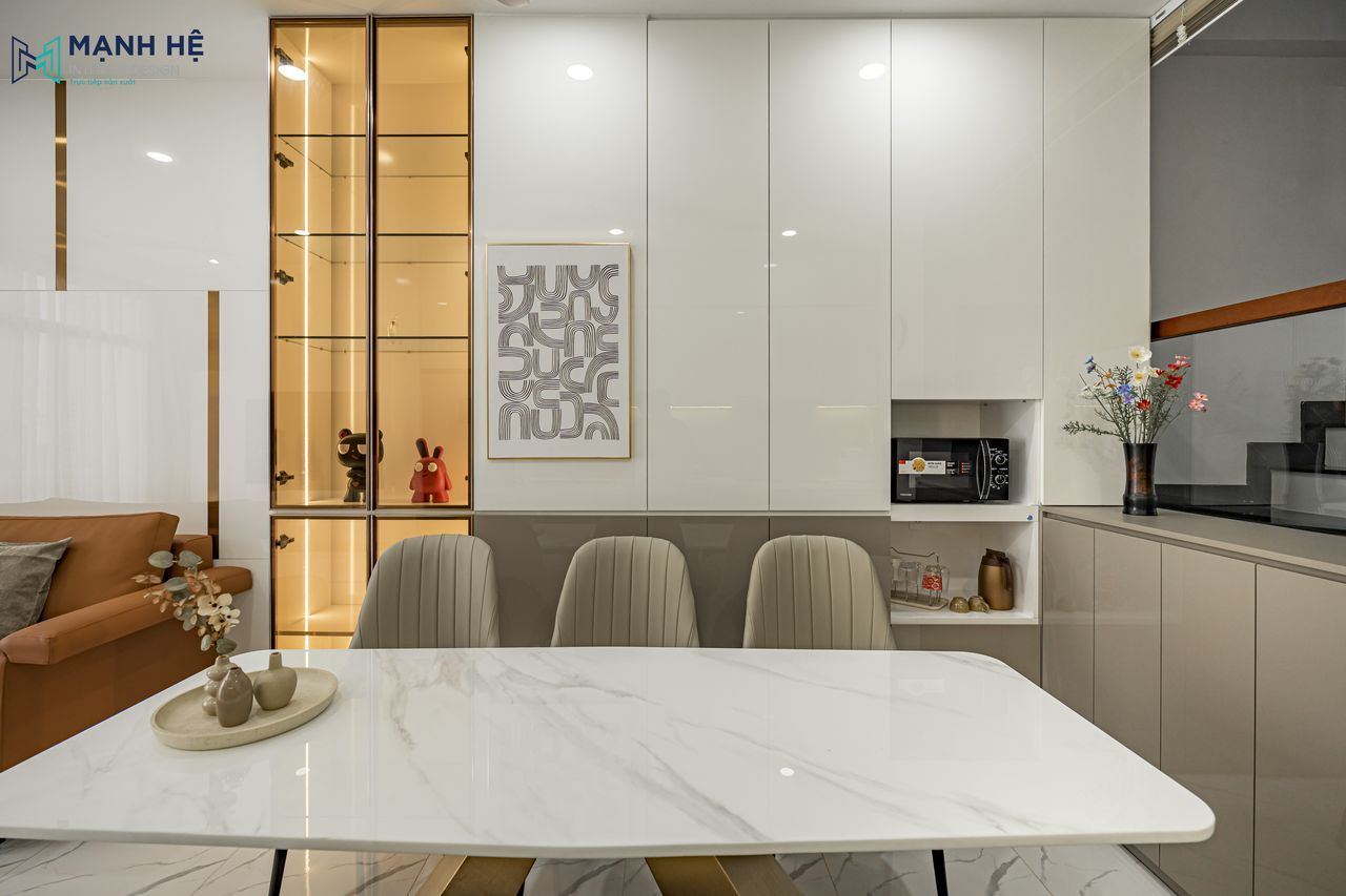 Khu vực phòng bếp được hoàn thiện liền mạch với không gian sinh hoạt chung, thể hiện rõ sự chỉnh chu trong từng chi tiết thi công. Hệ tủ bếp chữ I kịch trần được lắp đặt chuẩn xác về tỷ lệ và màu sắc, kết hợp bề mặt Acrylic bóng gương giúp không gian luôn sáng và gọn gàng, mang lại cảm giác sử dụng thoải mái trong sinh hoạt hằng ngày.