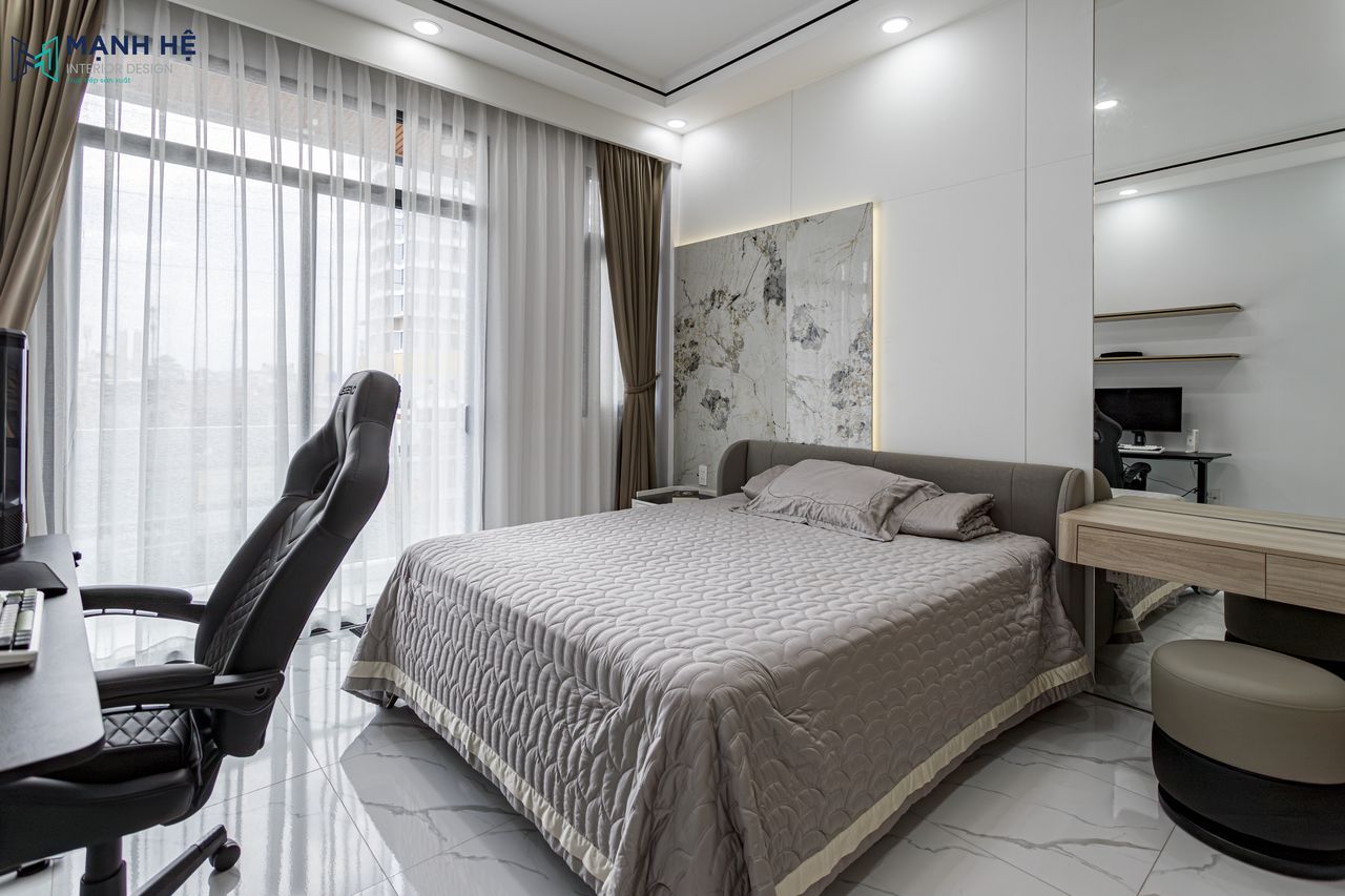 Phòng ngủ Master được hoàn thiện dựa trên nhu cầu thực tế của gia chủ, kết hợp khéo léo giữa nơi nghỉ ngơi và góc làm việc, giải trí tiện nghi.