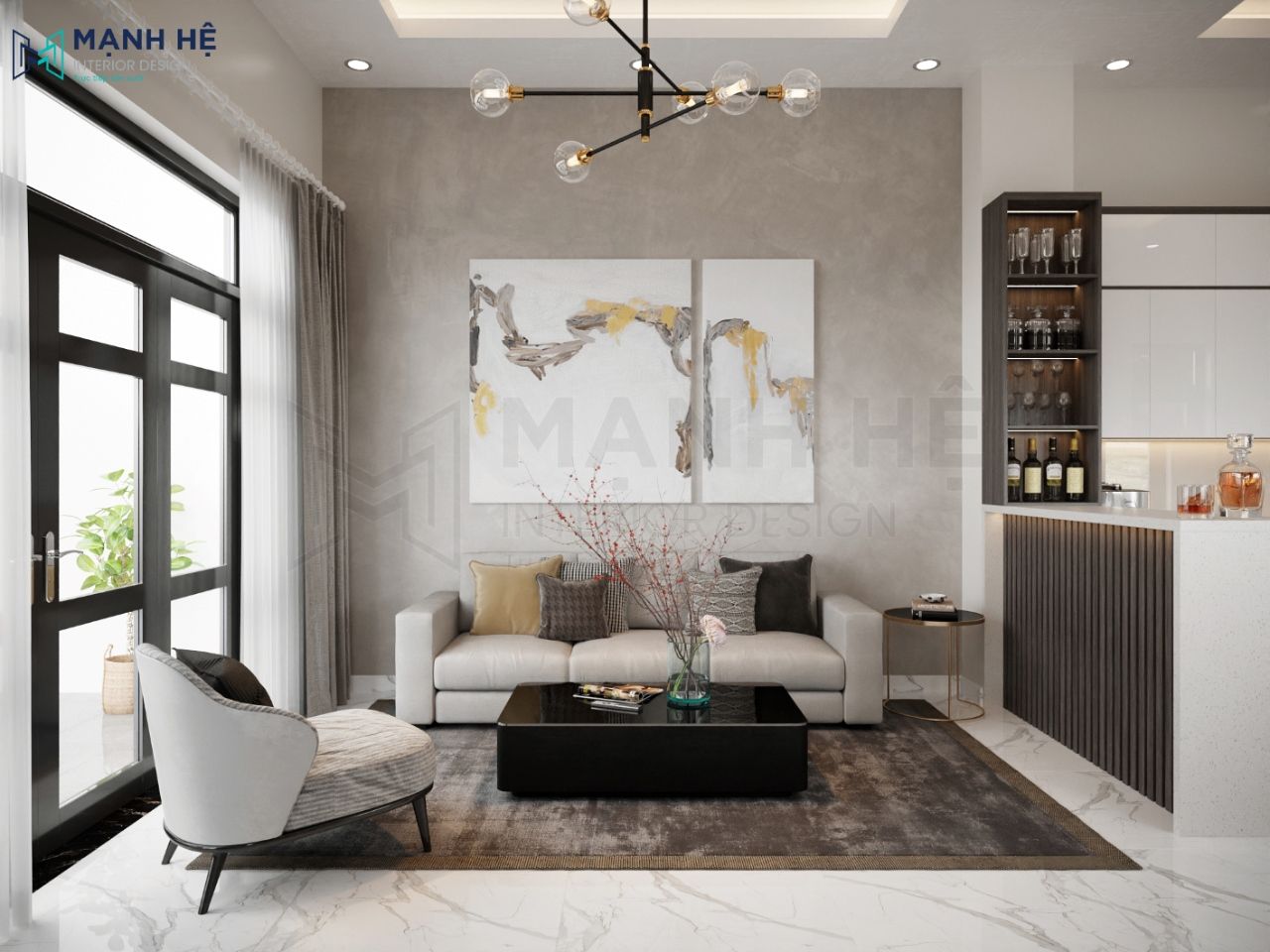 Thiết kế nội thất phòng khách theo phong cách hiện đại, sang trọng với gam màu ghi, xám là chủ đạo. Bố trí sofa chữ i ngắn với gam màu ấm áp kết hợp bàn trà tinh tế, sang trọng giúp gia chủ thuận tiện tiếp khách và thư giãn.