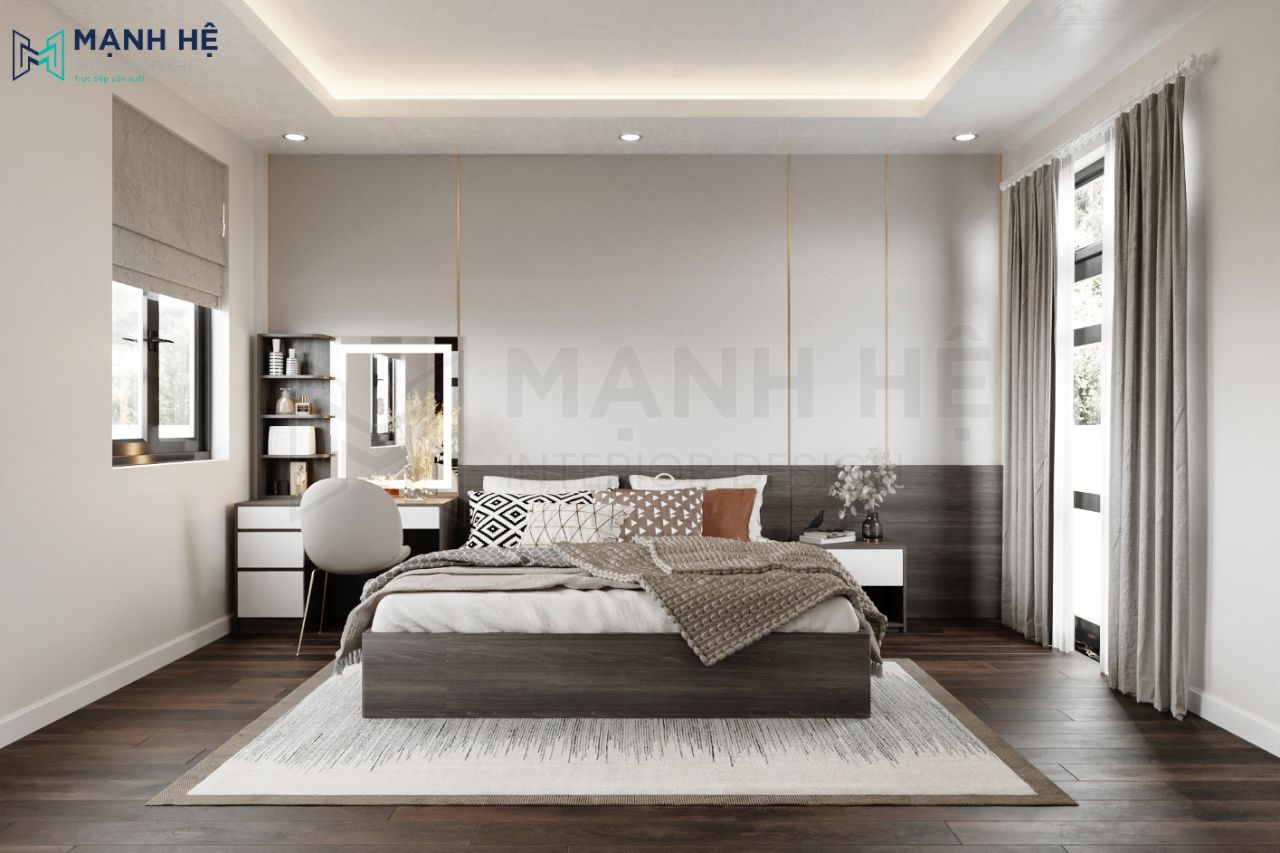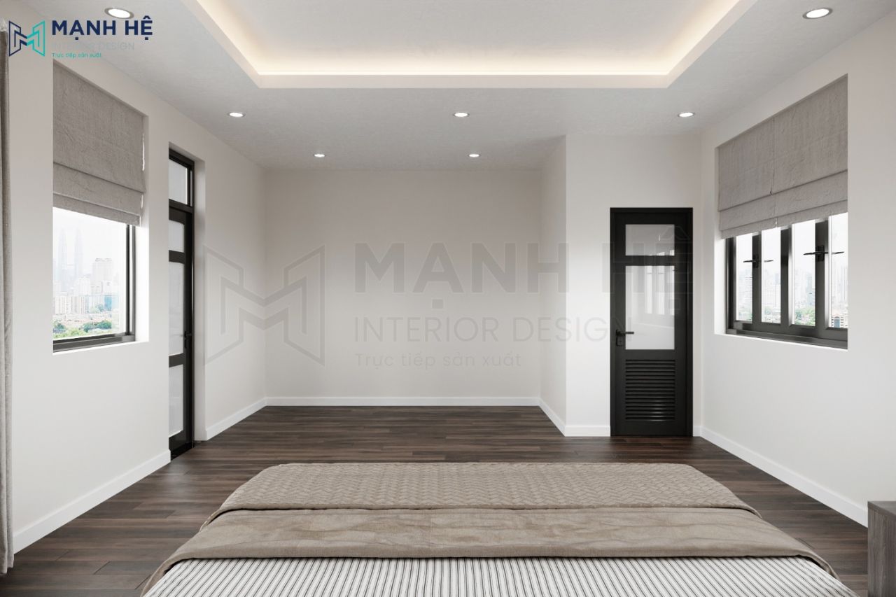 Hệ thống ánh sáng được tối ưu hợp lý với thiết kế cửa sổ lớn cùng hệ đèn led âm trần. Thiết kế rèm cửa roman với tone màu ghi sang trọng, lịch lãm mang lại cảm giác ấm áp, bình yên tạo giấc ngủ ngon cho gia chủ.