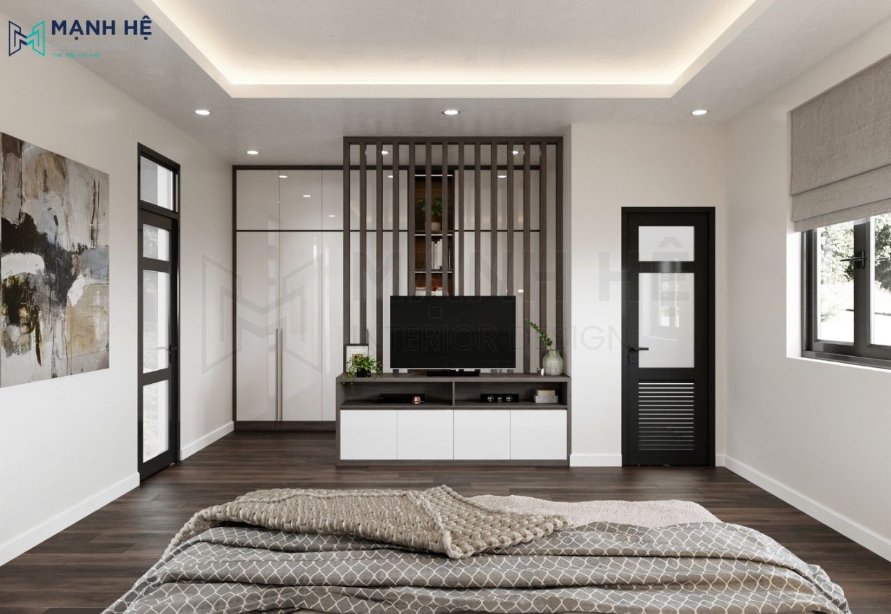 Thiết kế vách lam gỗ tạo điểm nhấn độc đáo, ngăn cách không gian giữa tủ quần áo và kệ tivi. Kệ tivi được thiết kế bằng gỗ công nghiệp hiện đại, sang trọng, giúp gia chủ tối ưu thêm không gian lưu trữ đồ đạc cho phòng ngủ.