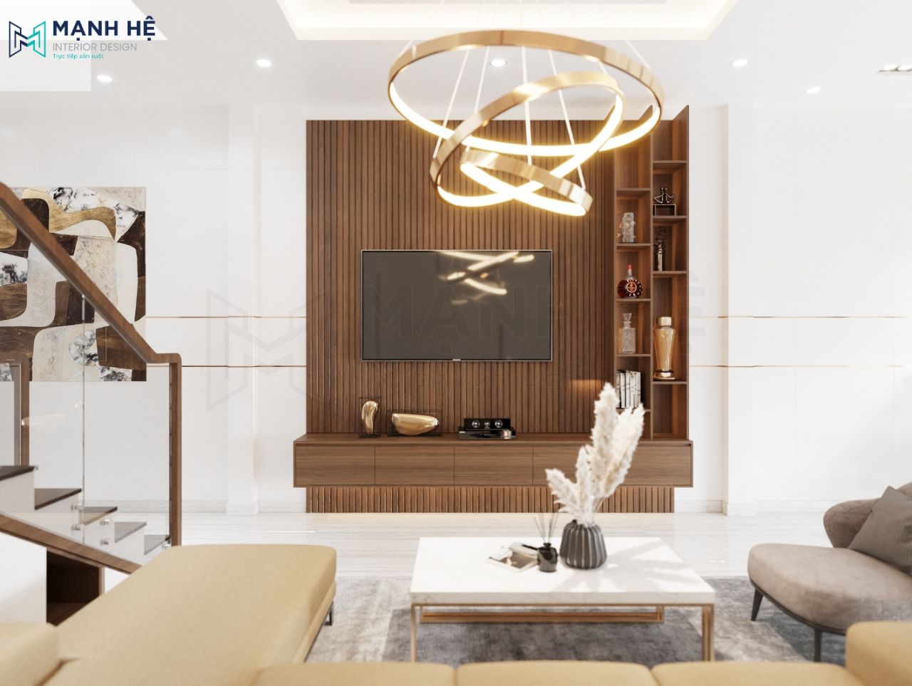 Vách ốp lam gỗ phía sau kệ tivi và kết hợp với kệ trang trí tối ưu không gian sử dụng cho gia chủ