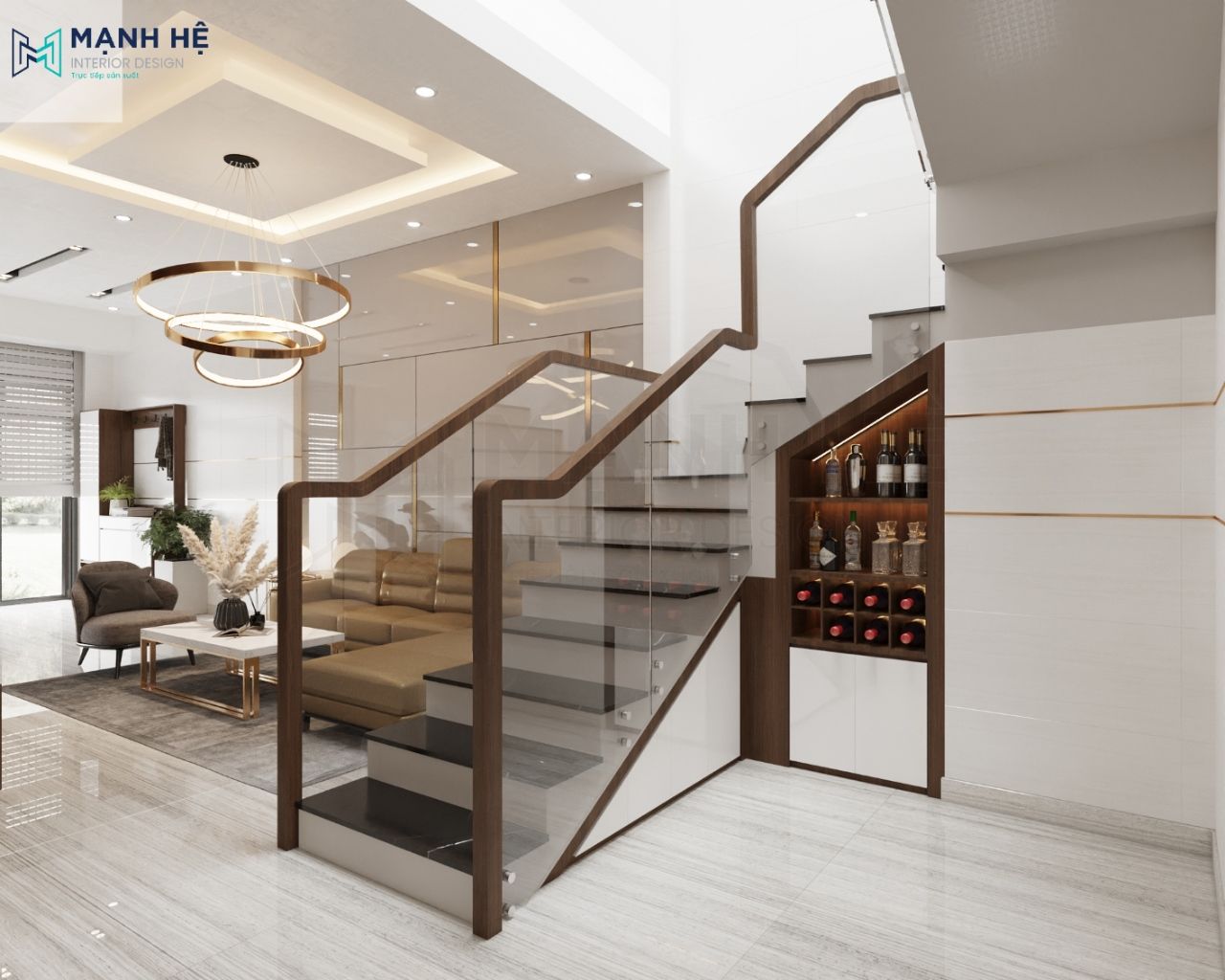 Tủ rượu âm cầu thang tích hợp ngăn tủ chứa tăng không gian lưu trữ cho gia chủ