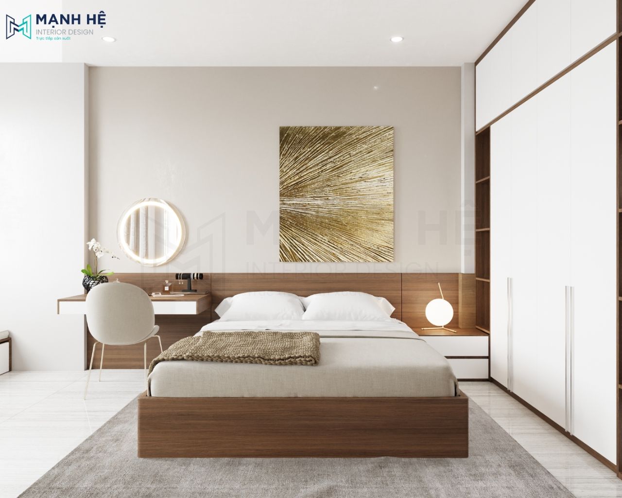 Hệ giường ngủ, bàn trang điểm treo tường và táp đầu giường được kết nối với nhau qua vách ốp đầu giường màu gỗ trầm