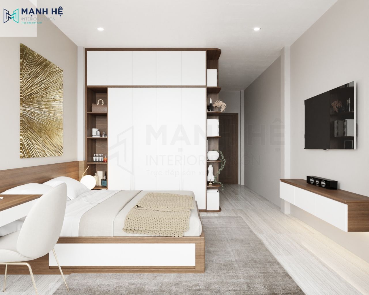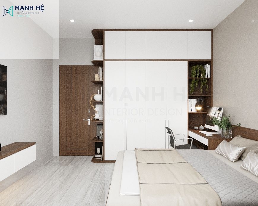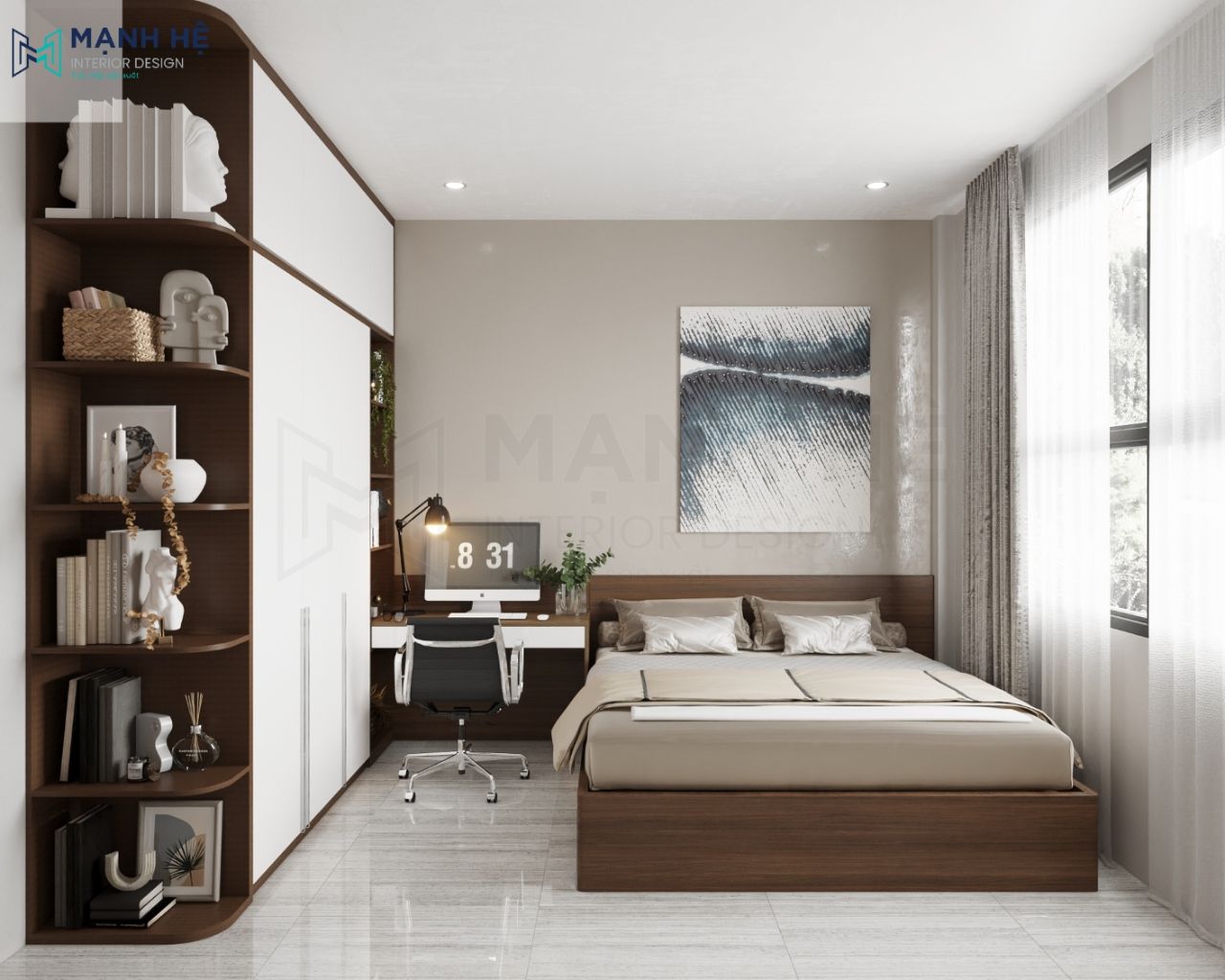 Nhằm tạo sự đồng bộ cho tổng thể căn nhà theo mong muốn của gia chủ, nên KTS Mạnh Hệ đã thực hiện lối thiết kế đơn giản,hiện đại như phòng ngủ 1, tuy nhiên tông màu gỗ được thay đổi màu gỗ trầm hơn nhiều. Và với đầy đủ tiện nghi từ giường, tủ quần áo hay bàn học. Ốp đầu giường tông màu gỗ tạo sự kết nối giữa giường ngủ và bàn trang điểm làm cho căn phòng thành khối đẹp mắt. Và bàn học thiết kế treo tường tối ưu diện tích gian phòng ngủ nhỏ.