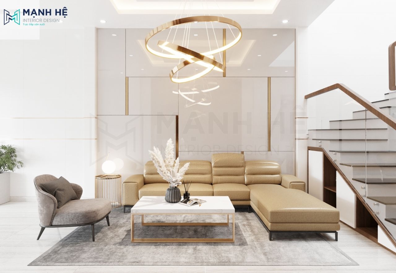 Phong cách nhà phố ngày hôm nay được KTS Mạnh Hệ sử dụng tông màu trắng nền nã, điểm thêm vào đó là màu nude tạo điểm nhấn sang trọng cho gian phòng khách. Với lối thiết kế hiện đại, sang trọng, nhưng vẫn nổi bật lên sự tinh tế đến lạ kì.