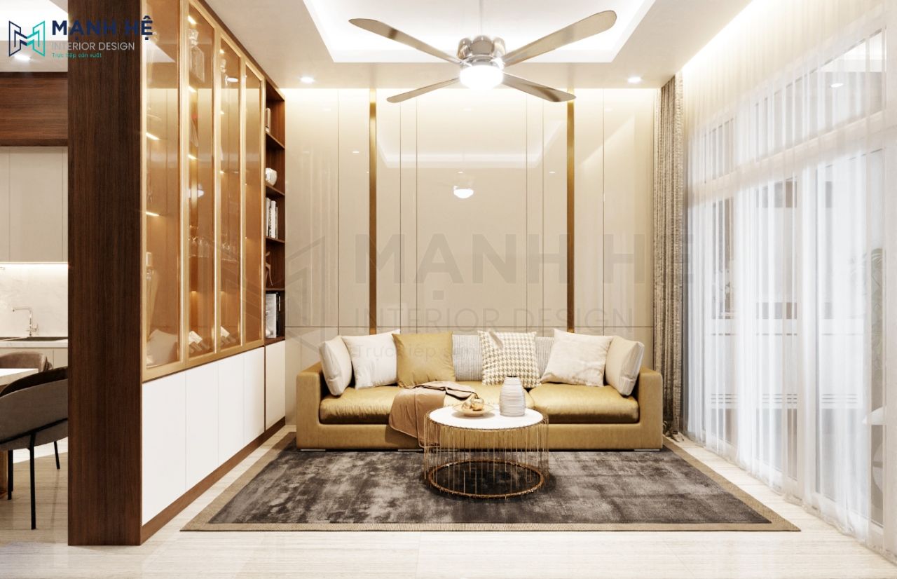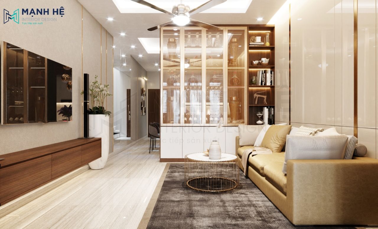 Thiết kế tủ rượu cánh kính cao đụng trần sang trọng, làm nơi trưng bày các bình rượu quý của gia chủ. Đồng thời kết hợp kệ trang trí để các món đồ decor xinh xắn giúp tăng tính thẩm mỹ cho phòng khách và khiến không gian đỡ nhàm chán. Ghế sofa kết hợp bàn trà và thảm lót tinh tế.