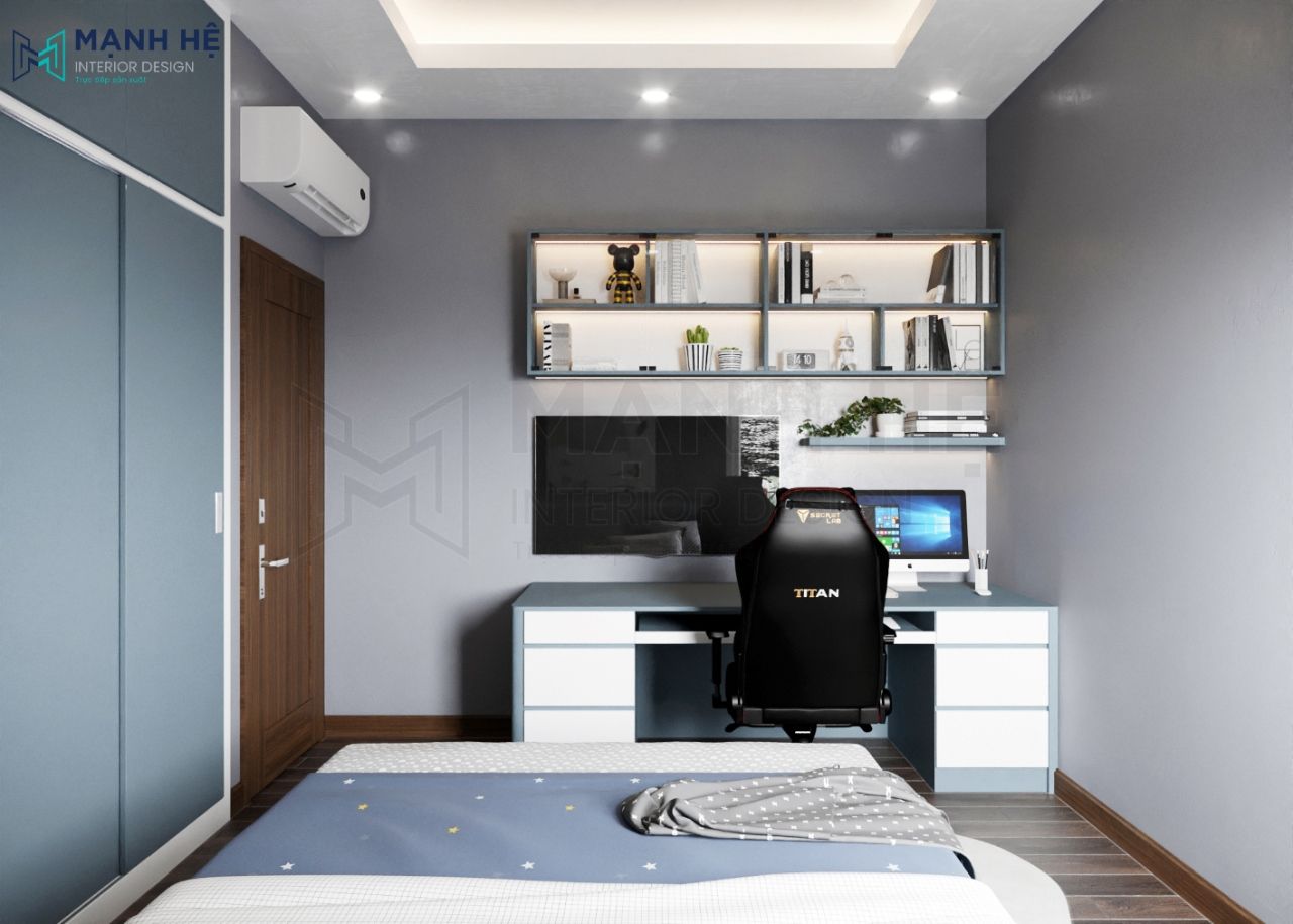 Thiết kế phòng ngủ con trai với tone màu xanh năng động cùng nội thất gỗ công nghiệp hiện đại, giường ngủ thông minh tích hợp thêm các ngăn hộc để đồ. Decor căn phòng bằng giấy dán tường và tranh treo tường. Bàn học tiện nghi với kệ sách treo tường gắn led rực rỡ.