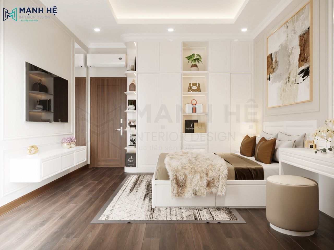 Không gian phòng ngủ master chọn gam màu trắng nhẹ nhàng với tiện nghi nội thất, tủ quần áo cao đụng trần đồng bộ màu trắng với không gian, tích hợp thêm kệ để túi xách và đồ trang trí. Trang trí tường bằng tranh vẽ họa tiết độc đáo.
