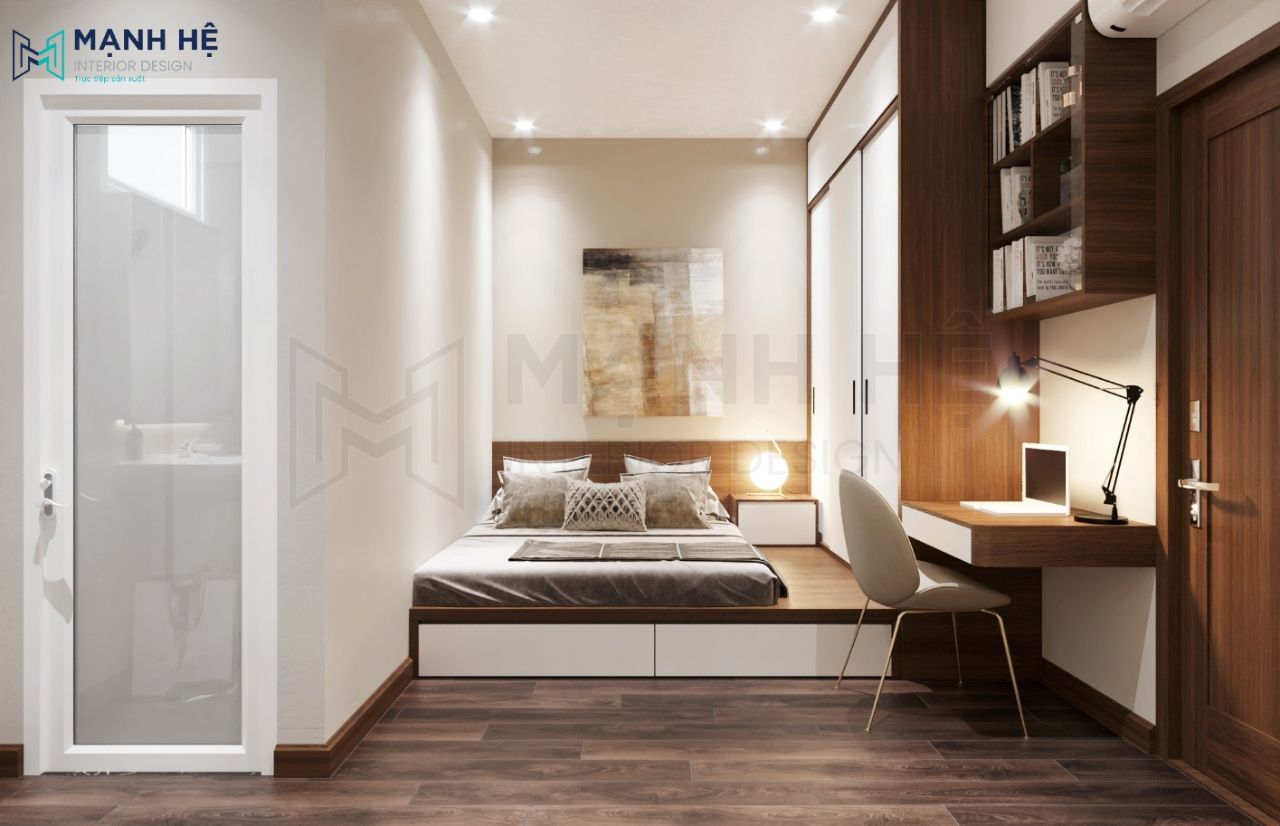 Phòng ngủ ông bà sử dụng giường ngủ dạng bục thấp để thuận tiện khi di chuyển, tích hợp tủ quần áo cánh lùa cao đụng trần. Tab đầu giường nhỏ làm nơi đặt đèn ngủ. Bàn đọc sách nhỏ đặt gần giường ngủ với phía trên là kệ sách treo tường.
