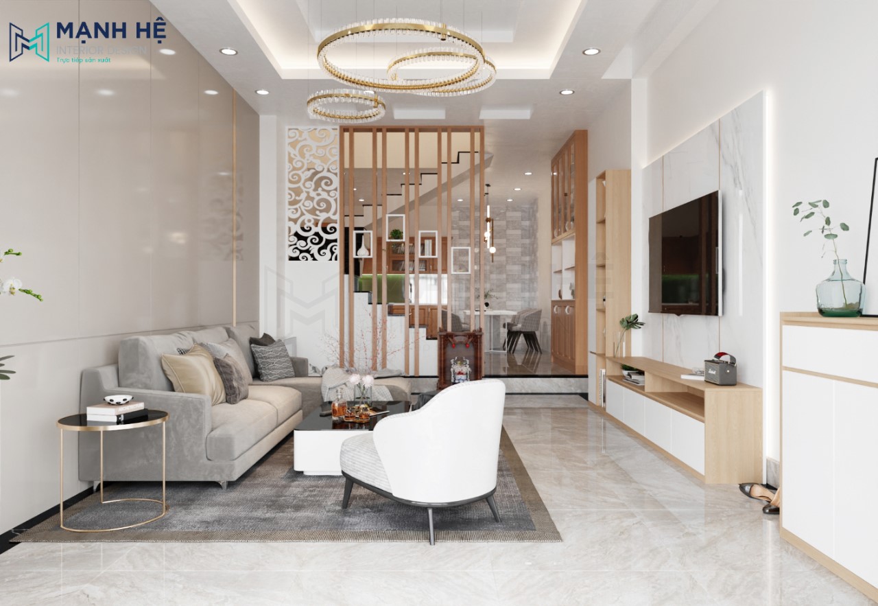 Thiết kế nội thất phòng khách nhà phố đẹp sang trọng với vách ốp gỗ acrylic