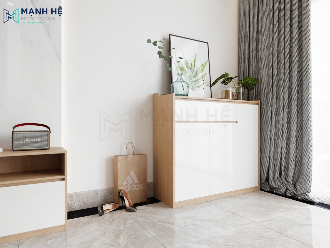 Tủ giày dép làm bằng gỗ công nghiệp đặt ngay cửa ra vào căn nhà phố