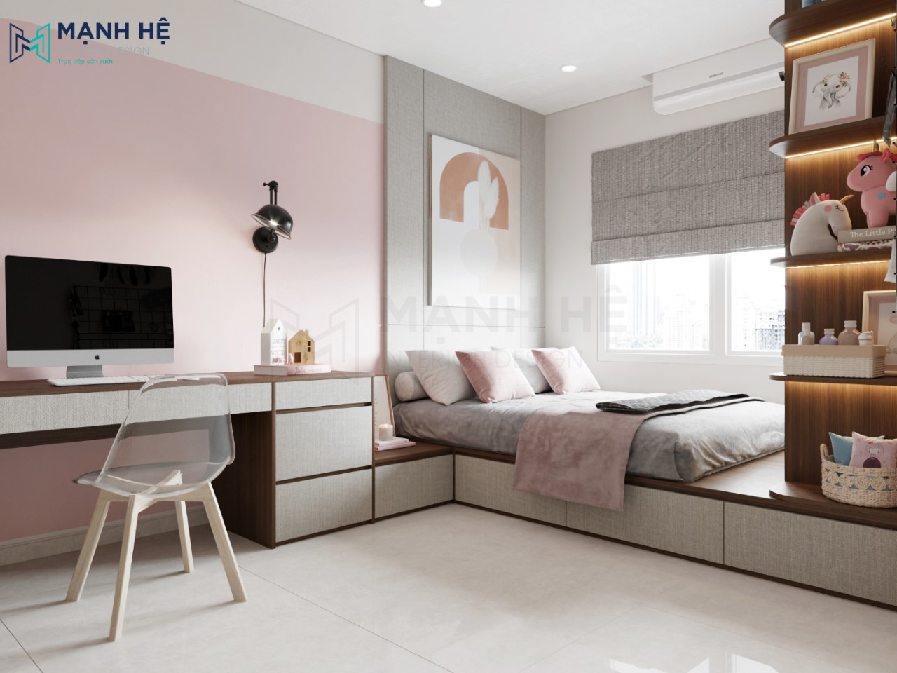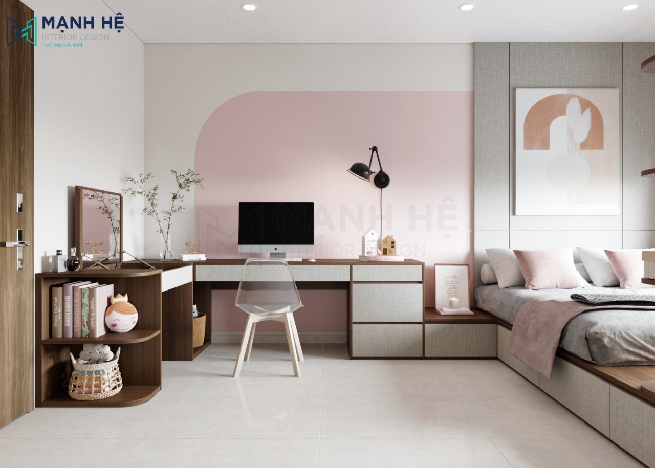 Bàn làm việc nối dài tích hợp thêm các ngăn hộc đựng đồ trang trí thu hút, kế bên là trang điểm với gương vuông mới lạ. Nhấn tường màu hồng cho căn phòng thêm thu hút.