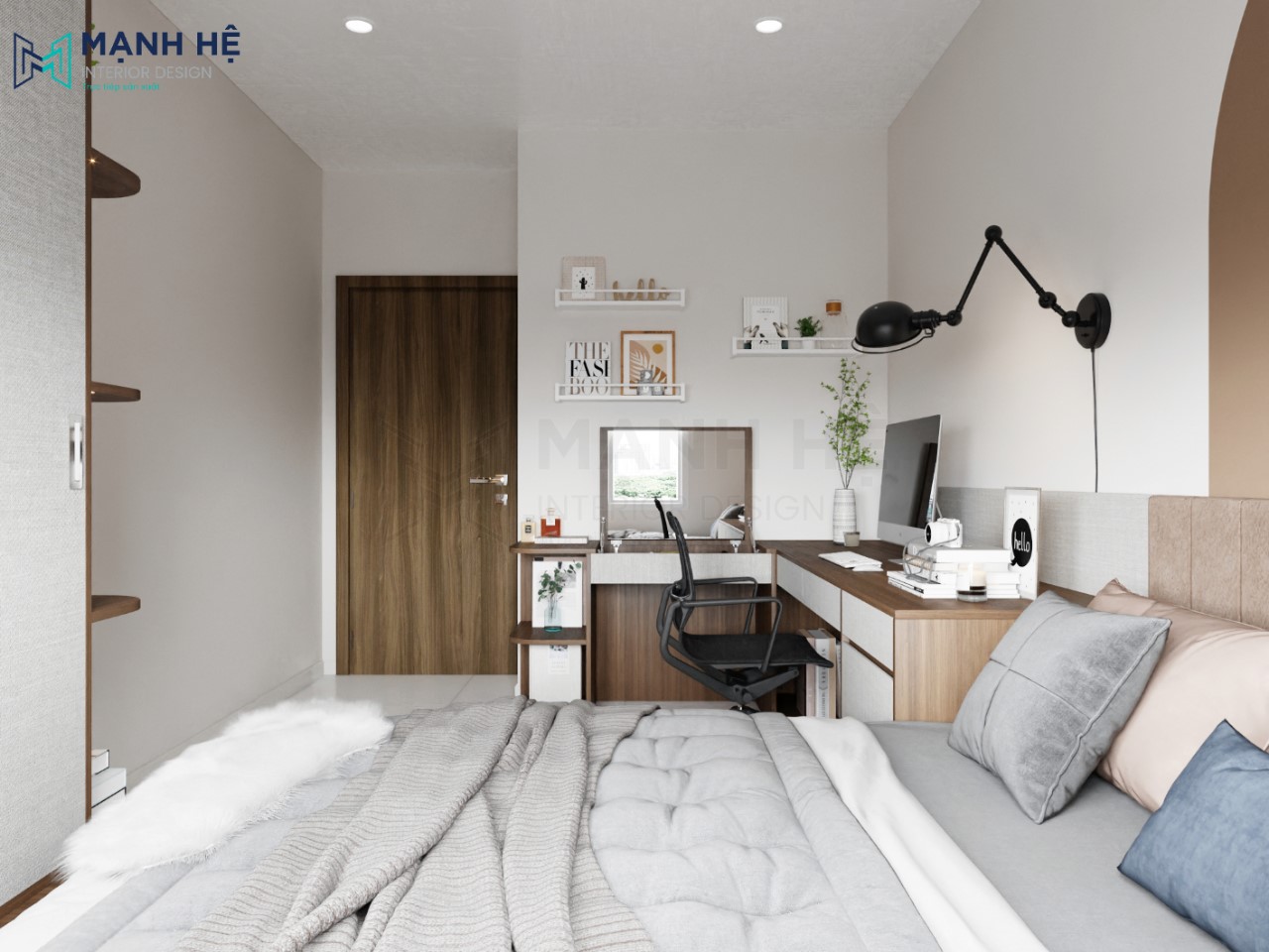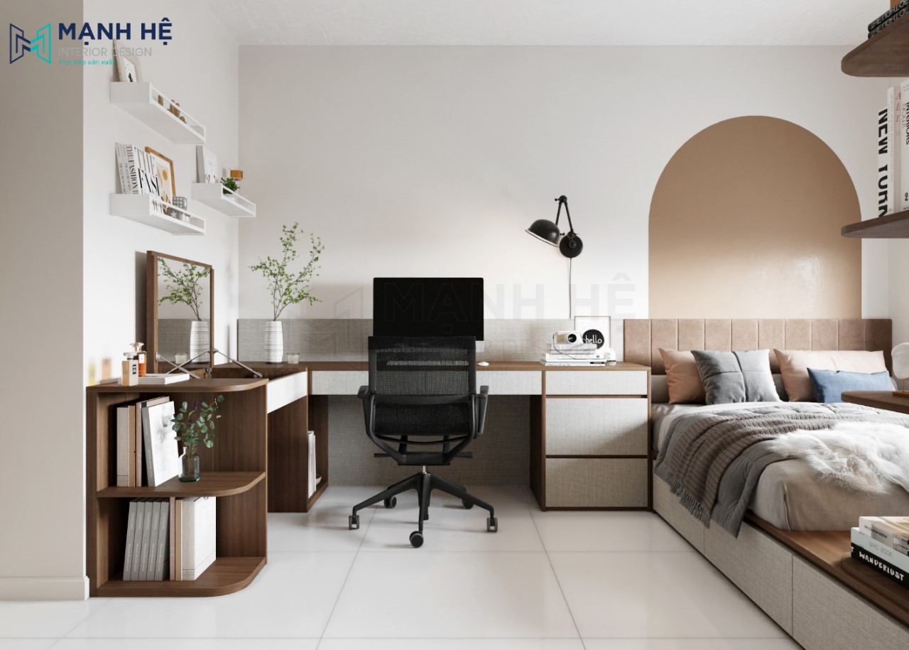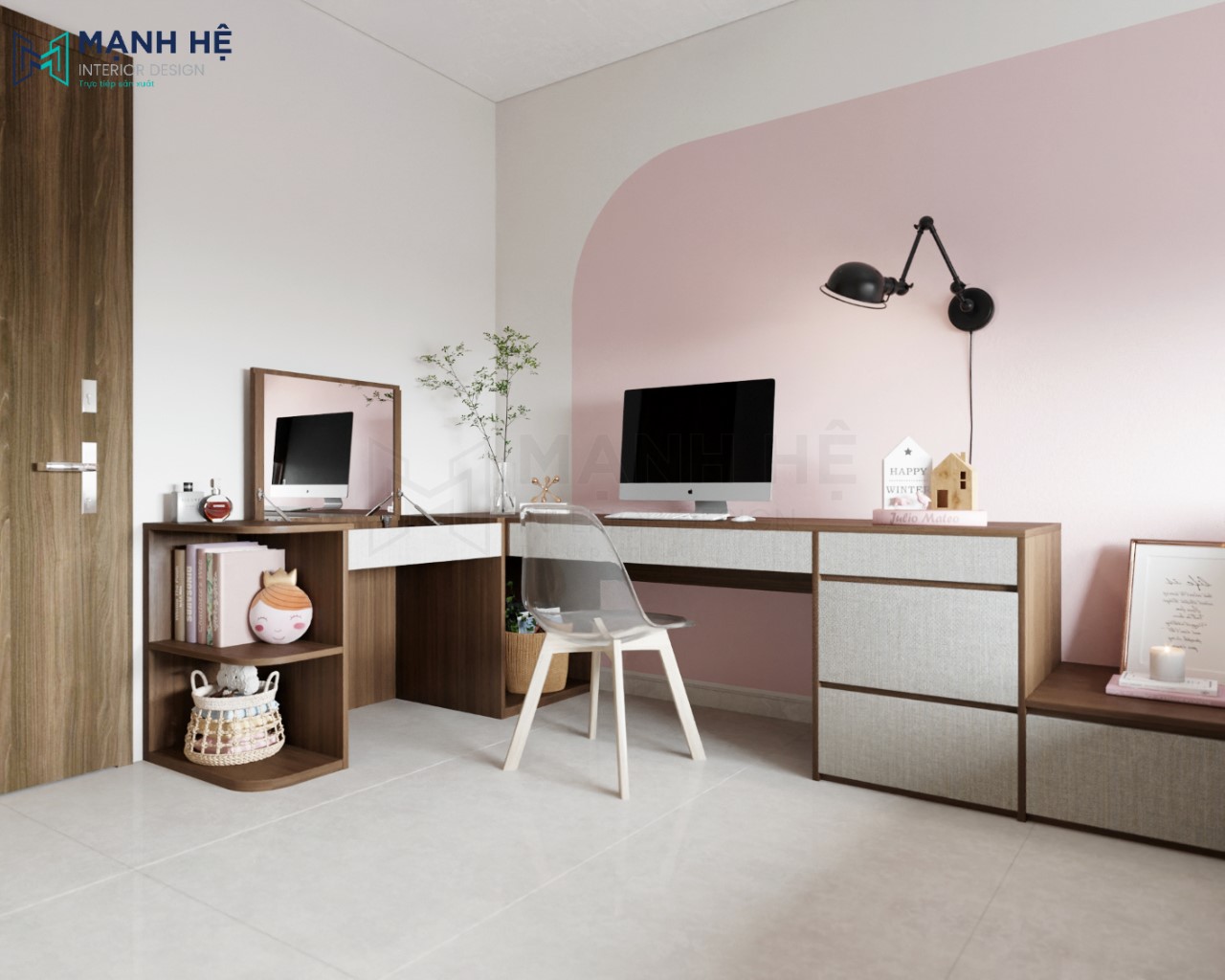 Bàn làm việc kết hợp bàn trang điểm tạo nên hình chữ L bo gọn góc phòng