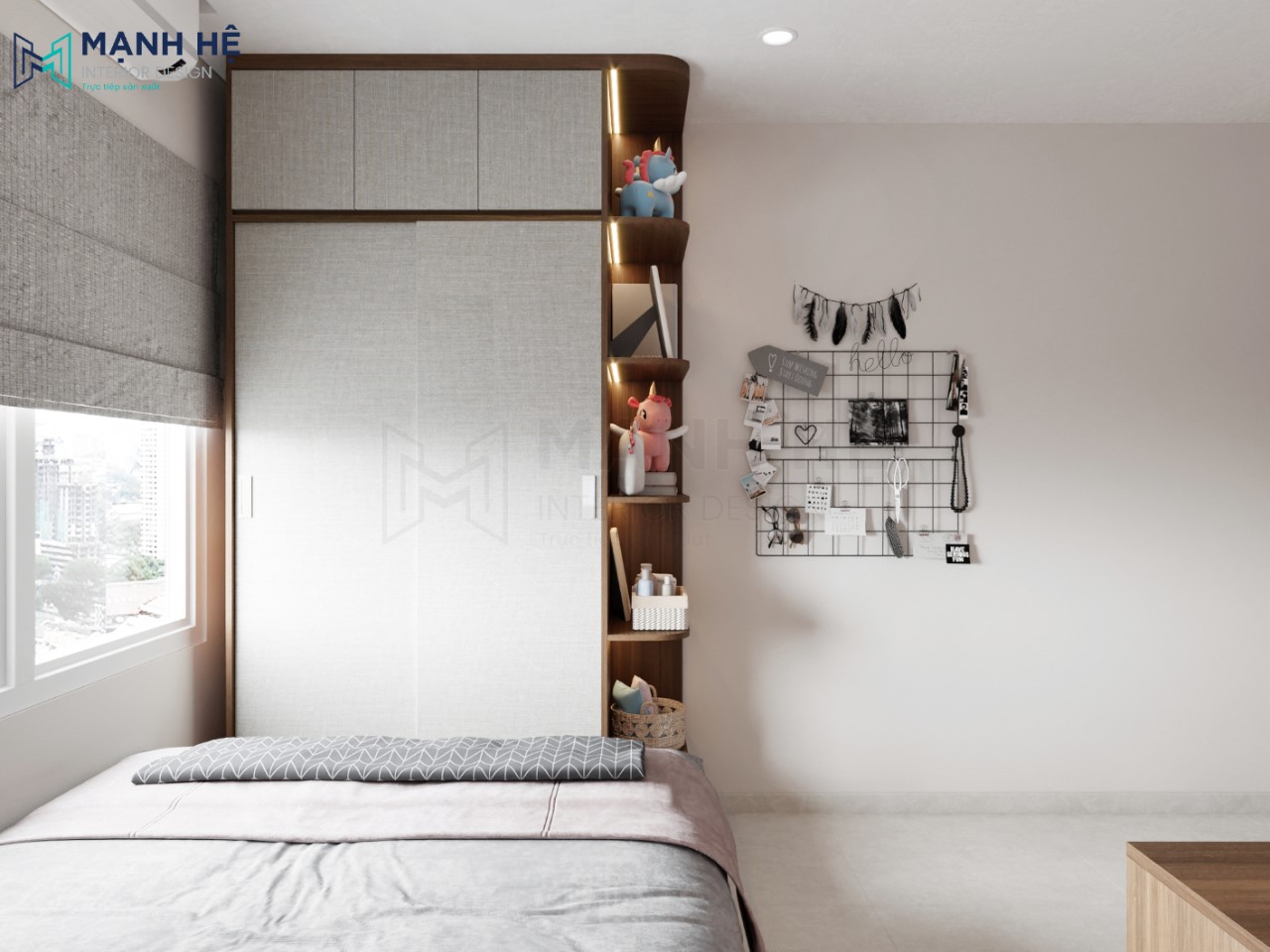 Dường như cách thiết kế phòng ngủ 02 này có phần tương tự phòng ngủ thứ 01 với giường bục đa năng tích hợp thêm tủ quần áo và các ngăn hộc chứa đồ. Tổng thể đường nét thiết kế và cách bố trí nội thất phòng ngủ thứ 02 này tương tự phòng ngủ 01. Tuy nhiên, thay vì phòng ngủ 01 có xu hướng thiên về màu hồng thì phòng ngủ này lại thiên về màu nâu.