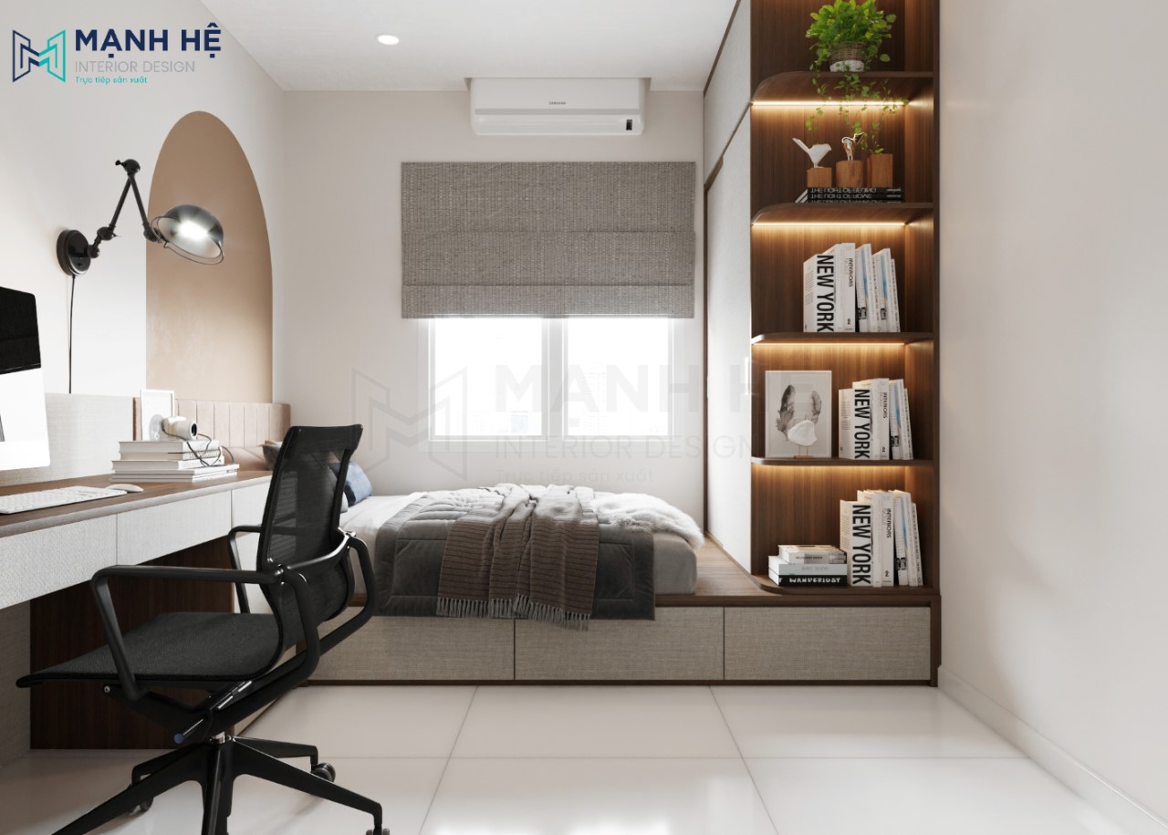 Thiết kế nội thất phòng ngủ đa năng với giường dạng bục